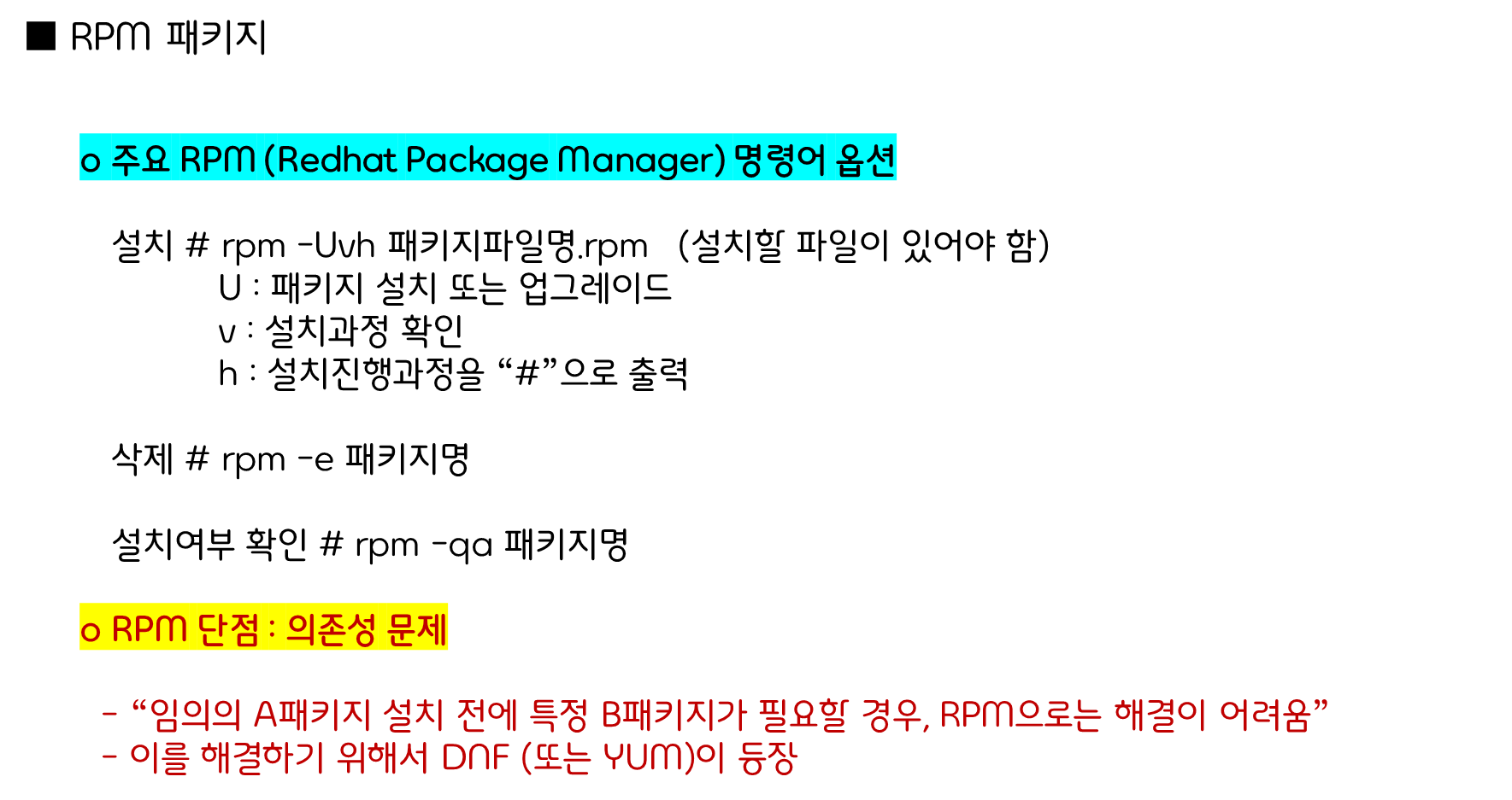 RPM 명령어는 RPM 패키지를 관리하는 데 사용하는 강력한 도구입니다. 기본적인 설치, 제거, 업데이트 외에도 다양한 옵션과 기능을 제공하여 시스템 관리를 효율적으로 수행할 수 있도록 도와줍니다.