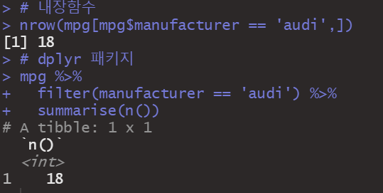 nrow(mpg[mpg$컬럼명 == "값", ]) # 특정컬럼의 값에 맞는 레코드만 counting