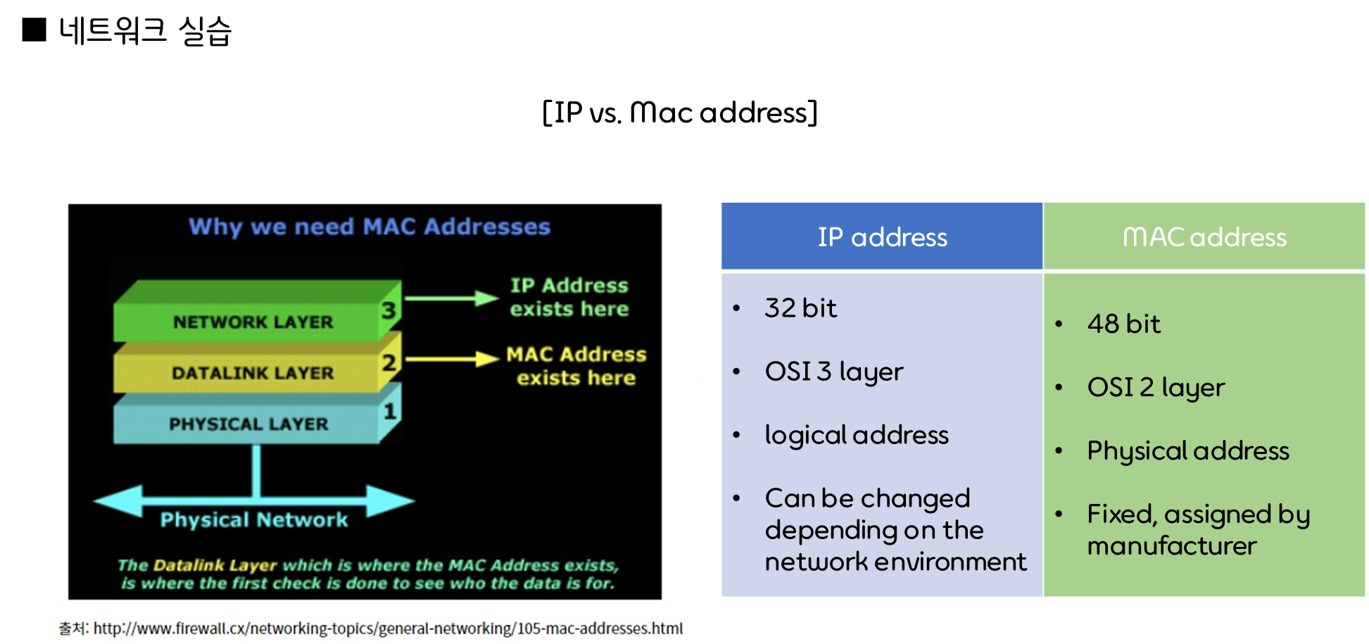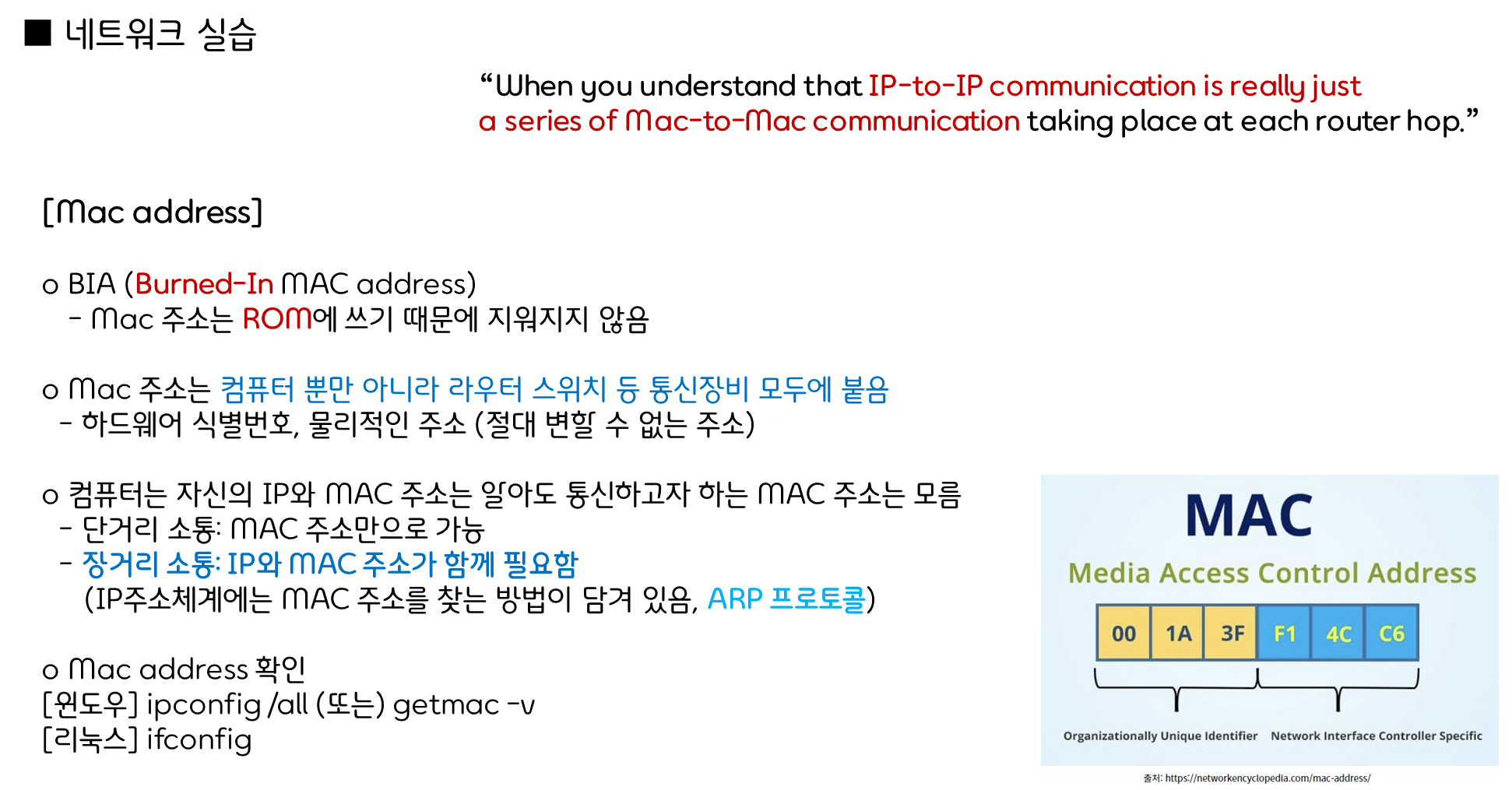 - 정의: 네트워크 인터페이스 카드(NIC)에 고유하게 부여된 물리적인 주소입니다.