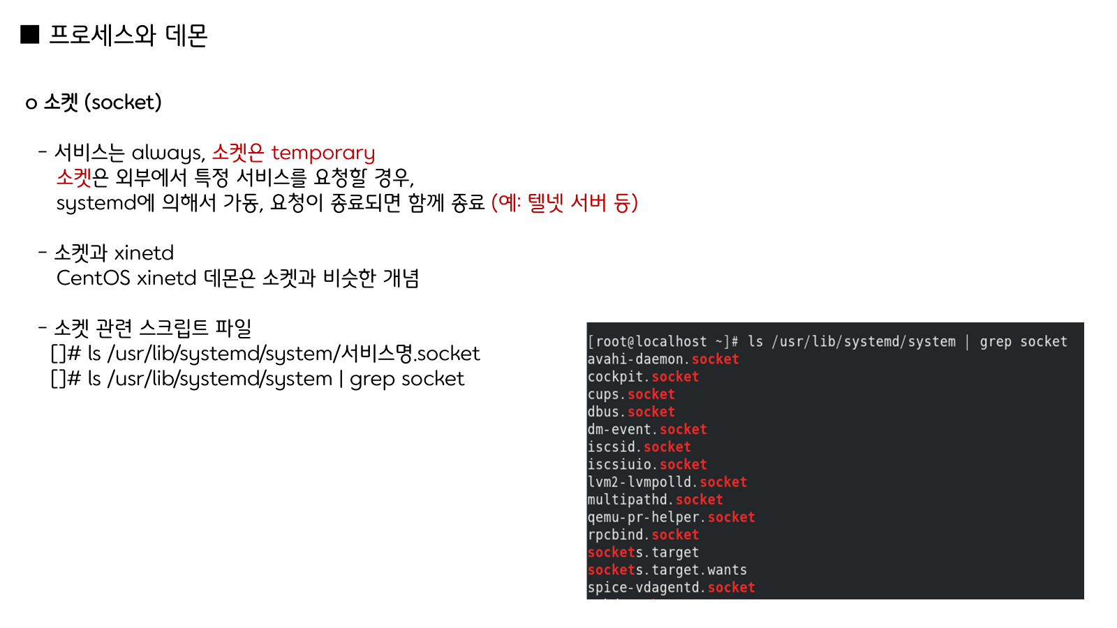 - 역할: 데몬은 서비스를 구현하며, 소켓은 통신을 위한 연결점입니다.