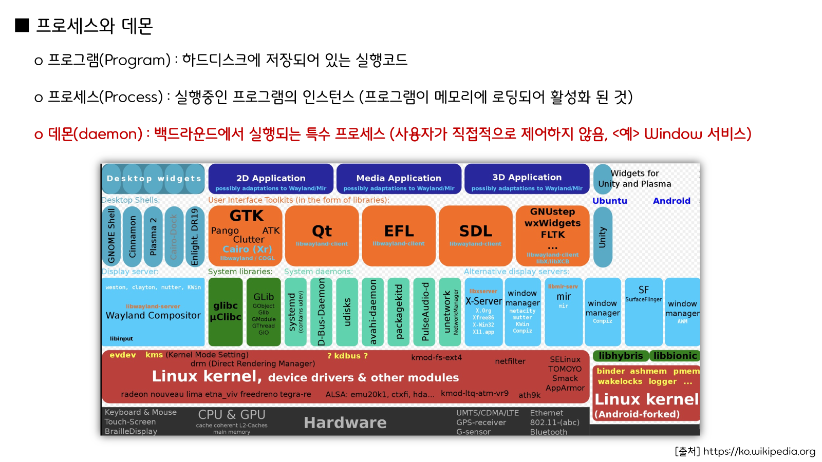 - 프로세스 이름에 'd'가 붙는 경우가 많음: 예를 들어, HTTP 서버 데몬은 httpd, SSH 서버 데몬은 sshd라고 부릅니다.