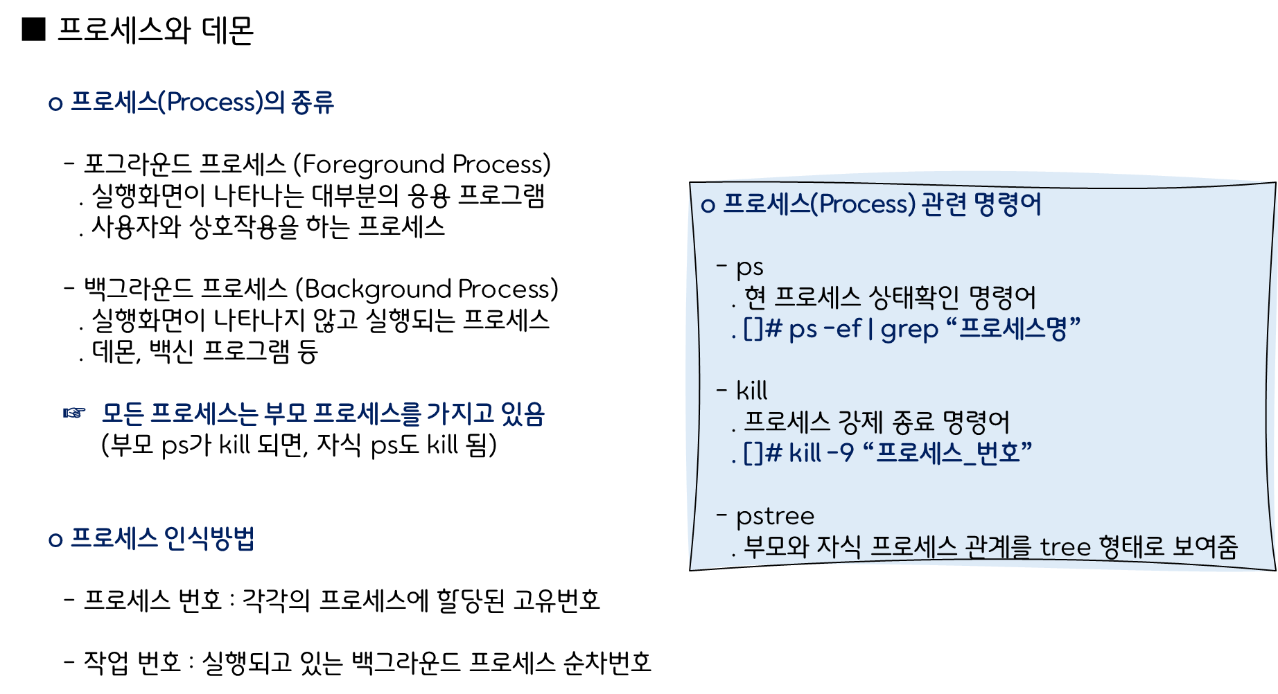 - 포그라운드 프로세스: 사용자가 직접 명령어를 입력하거나 프로그램을 실행하여 생성되는 프로세스입니다. 사용자가 직접 제어하고 상호작용할 수 있으며, 사용자가 작업을 종료하면 프로세스도 종료됩니다.