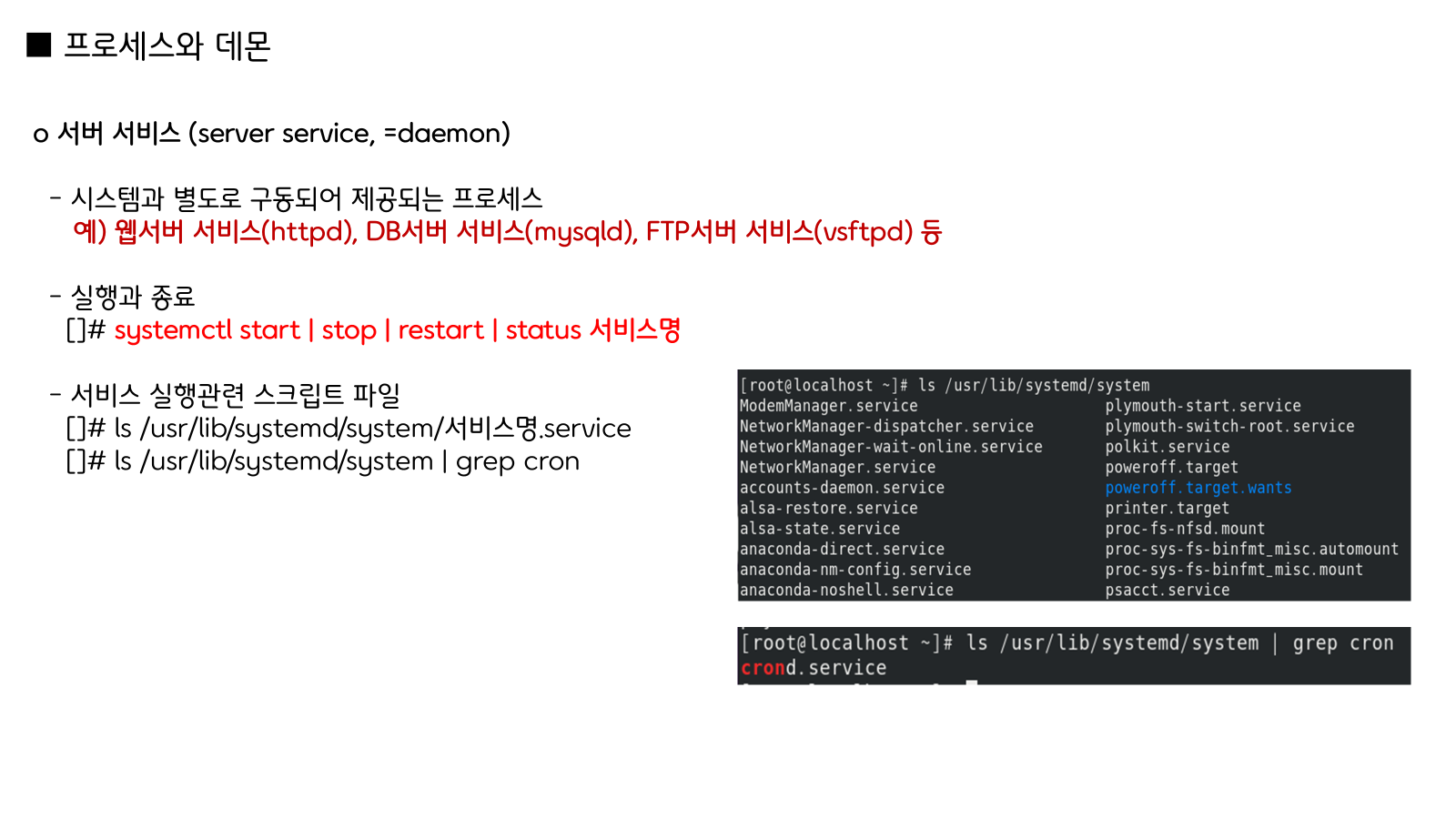 ☞ systmed: 최신 리눅스 시스템에서는 systemd라는 시스템 및 서비스 관리자를 사용하여 데몬을 관리합니다. systemd는 데몬을 유닛이라고 부르며, 유닛 파일을 통해 데몬의 동작을 설정합니다.