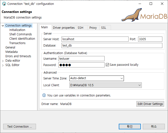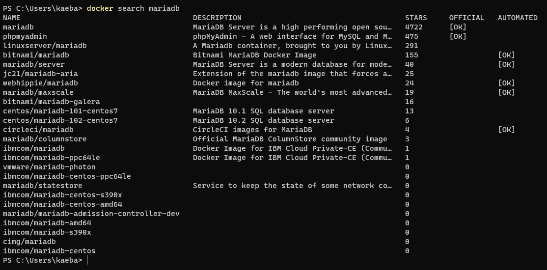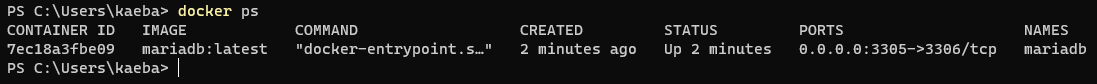 $ docker run --name mariadb -v d:/docker_volume/mariadb:/var/lib/mysql -e MARIADB_ROOT_PASSWORD=root -d -p 3305:3306 mariadb:latest