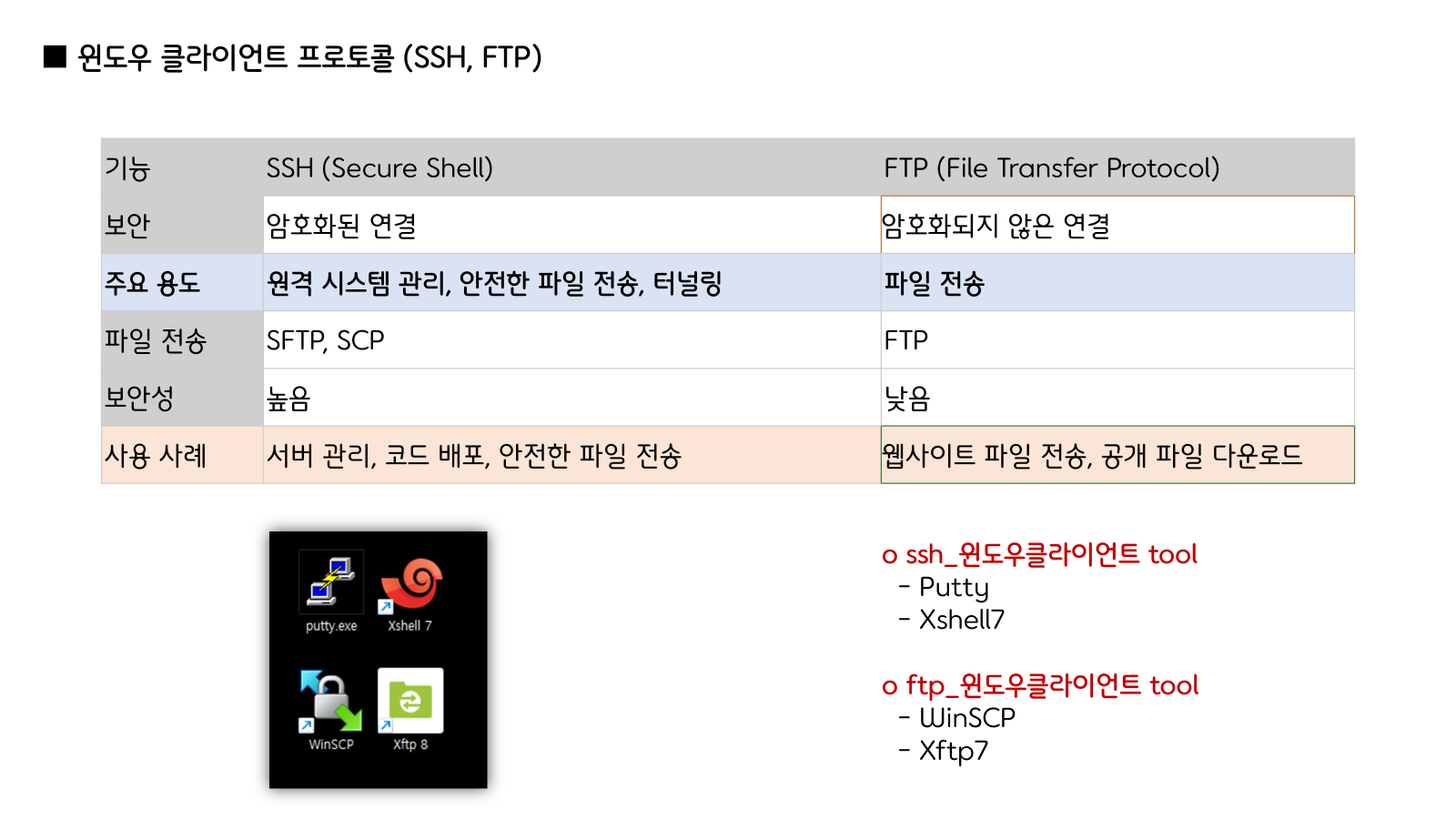 ▶ SSH(Secure Shell)와 FTP(File Transfer Protocol)는 모두 원격 컴퓨터에 접속하여 작업을 수행하거나 파일을 전송하는 데 사용되는 프로토콜이지만, 보안성과 기능 면에서 큰 차이가 있습니다.