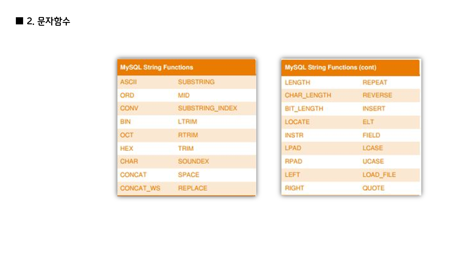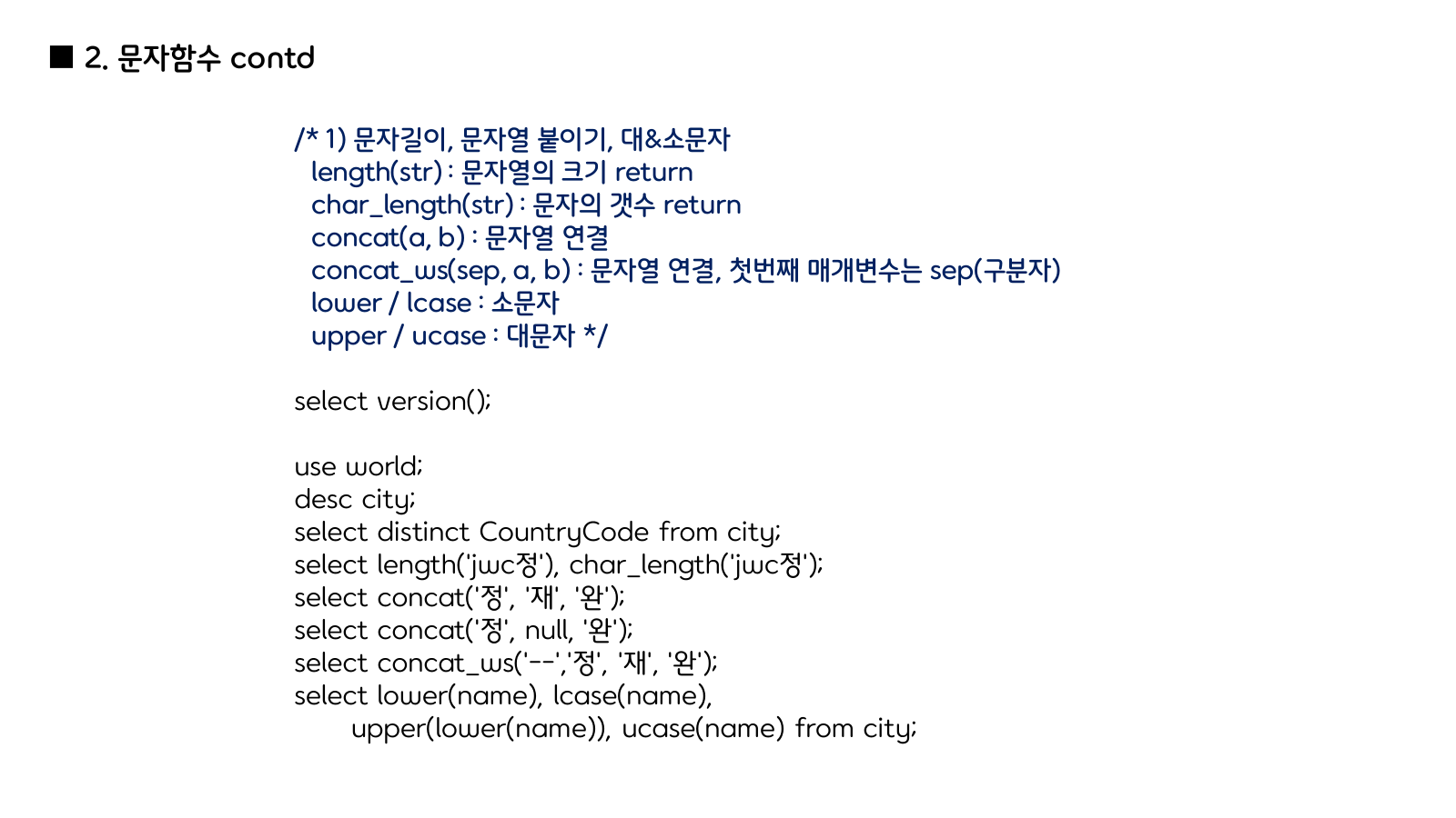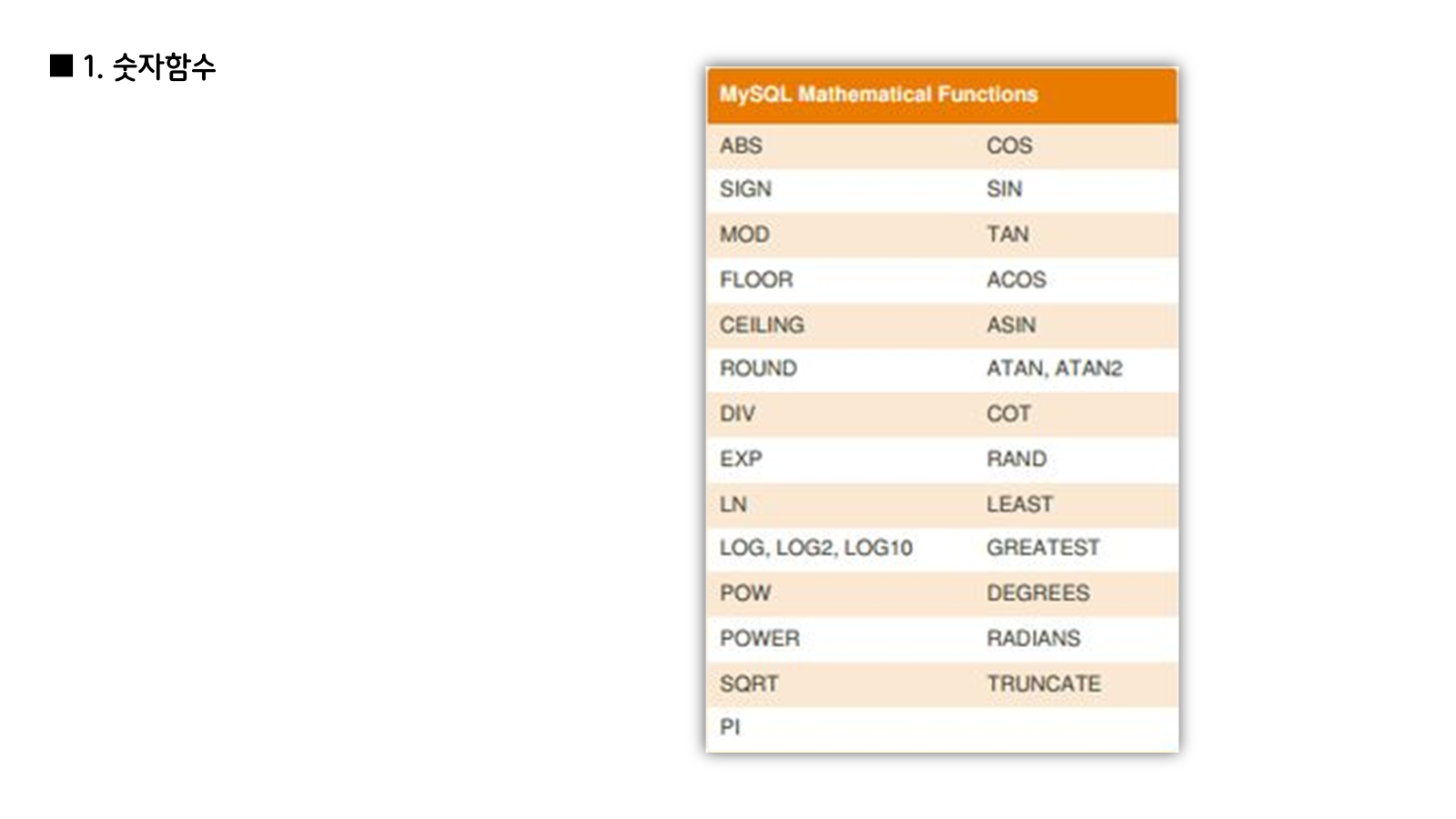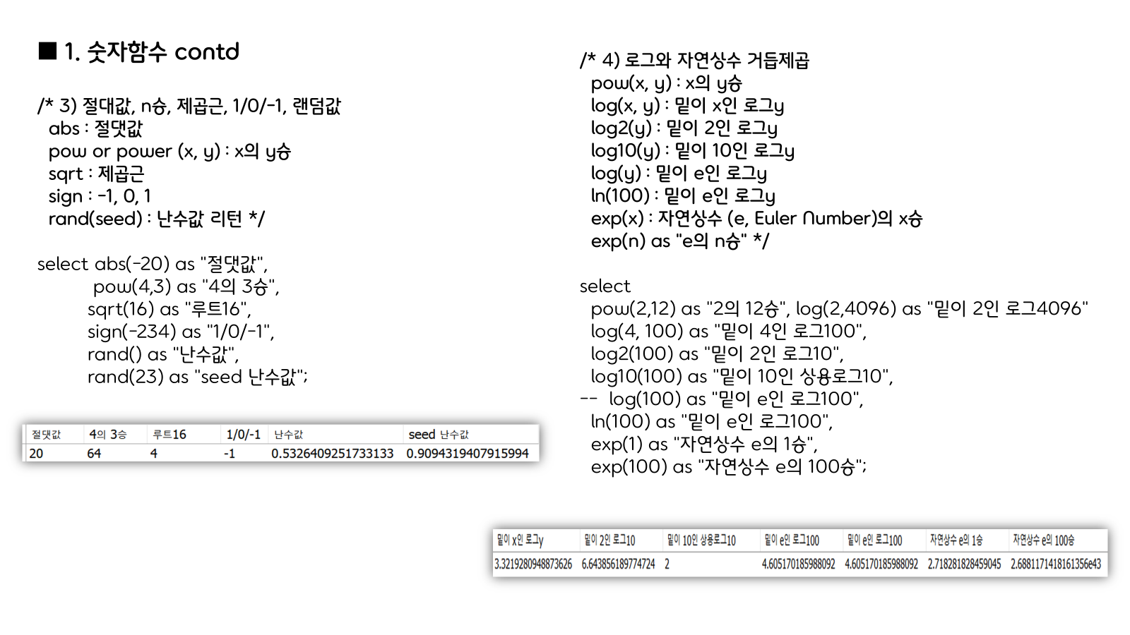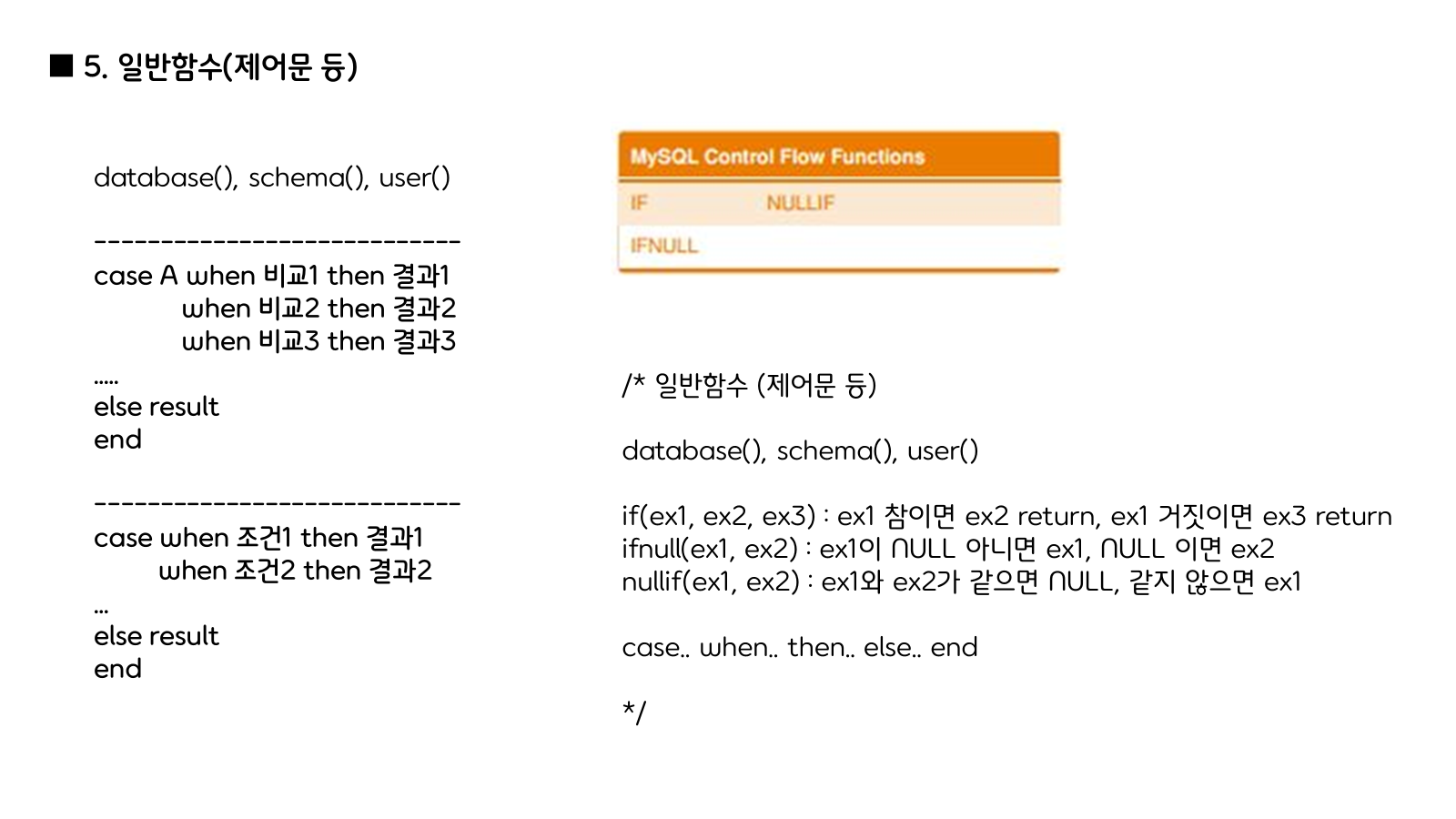 MySQL은 다양한 단일행 함수를 제공하며, 각 함수는 특정한 목적을 수행하도록 설계되었습니다. 대표적인 단일행 함수 종류와 활용 예시는 다음과 같습니다.