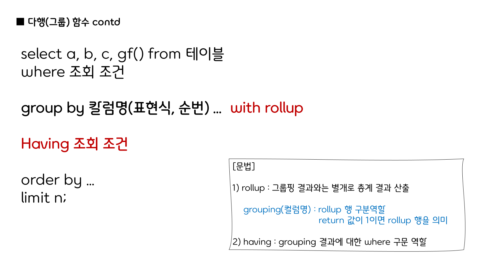 MySQL 다행(그룹) 함수는 데이터를 그룹화하고 그룹별 집계 결과를 계산하는 데 사용되는 함수입니다. 대표적인 다행 함수로는 GROUP BY, HAVING, COUNT, SUM, AVG, MIN, MAX 등이 있습니다.
