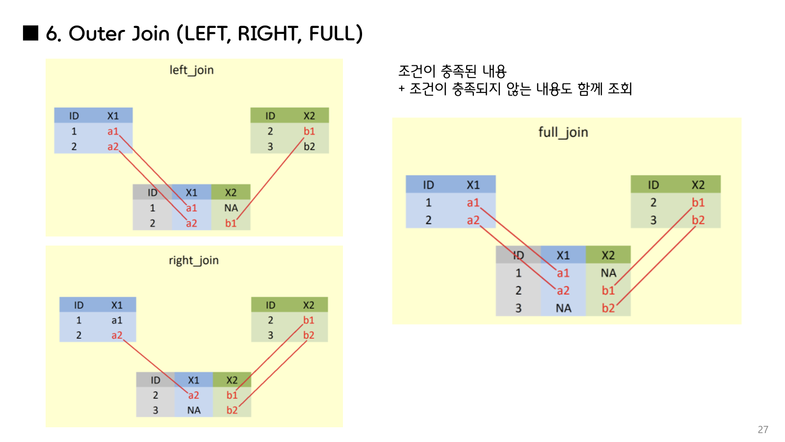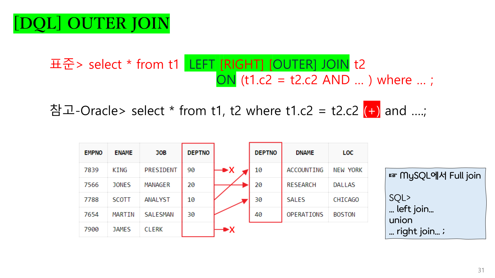 | FULL OUTER JOIN | 지원 | ❌ 직접 지원 안함 |