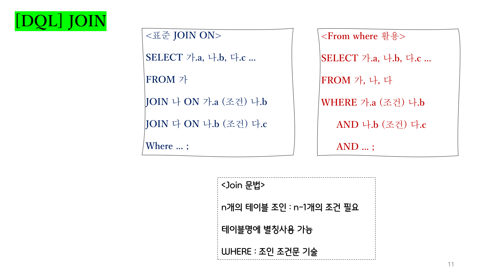 | LEFT JOIN | SELECT ... FROM A LEFT JOIN B ON A.id = B.id; | A는 모두 포함, B는 일치하는 것만 |