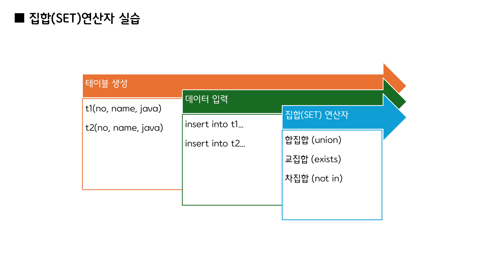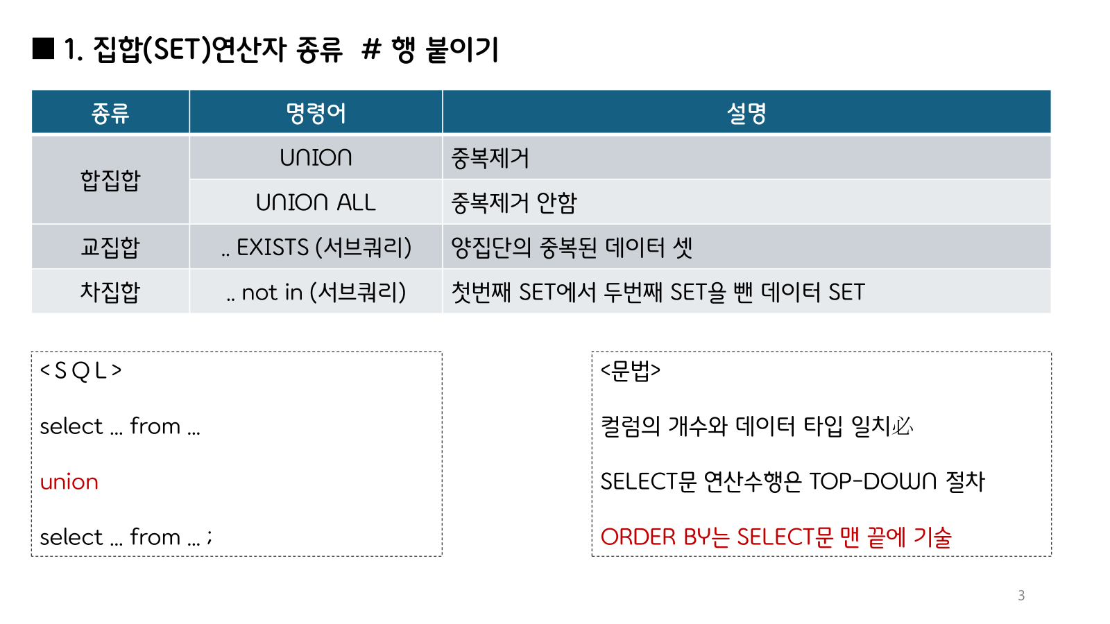 SET 연산은 두 SELECT 결과를 집합 연산자처럼 다루는 SQL 문법입니다.