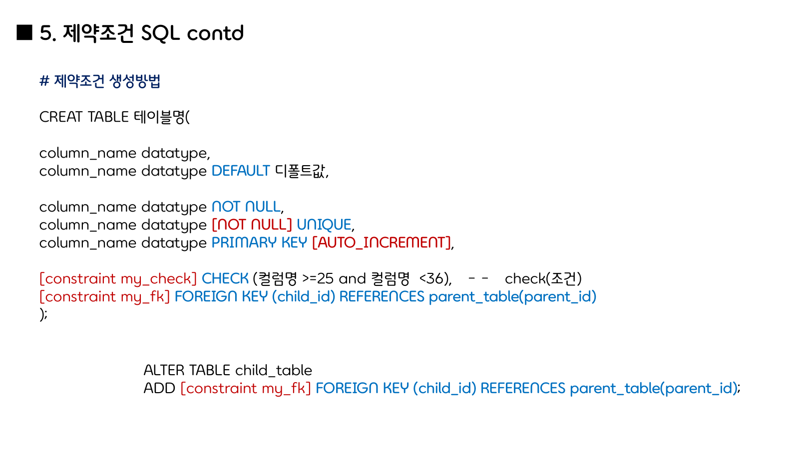| 제약조건 삭제 방식 | DROP CONSTRAINT | DROP FOREIGN KEY, DROP INDEX |