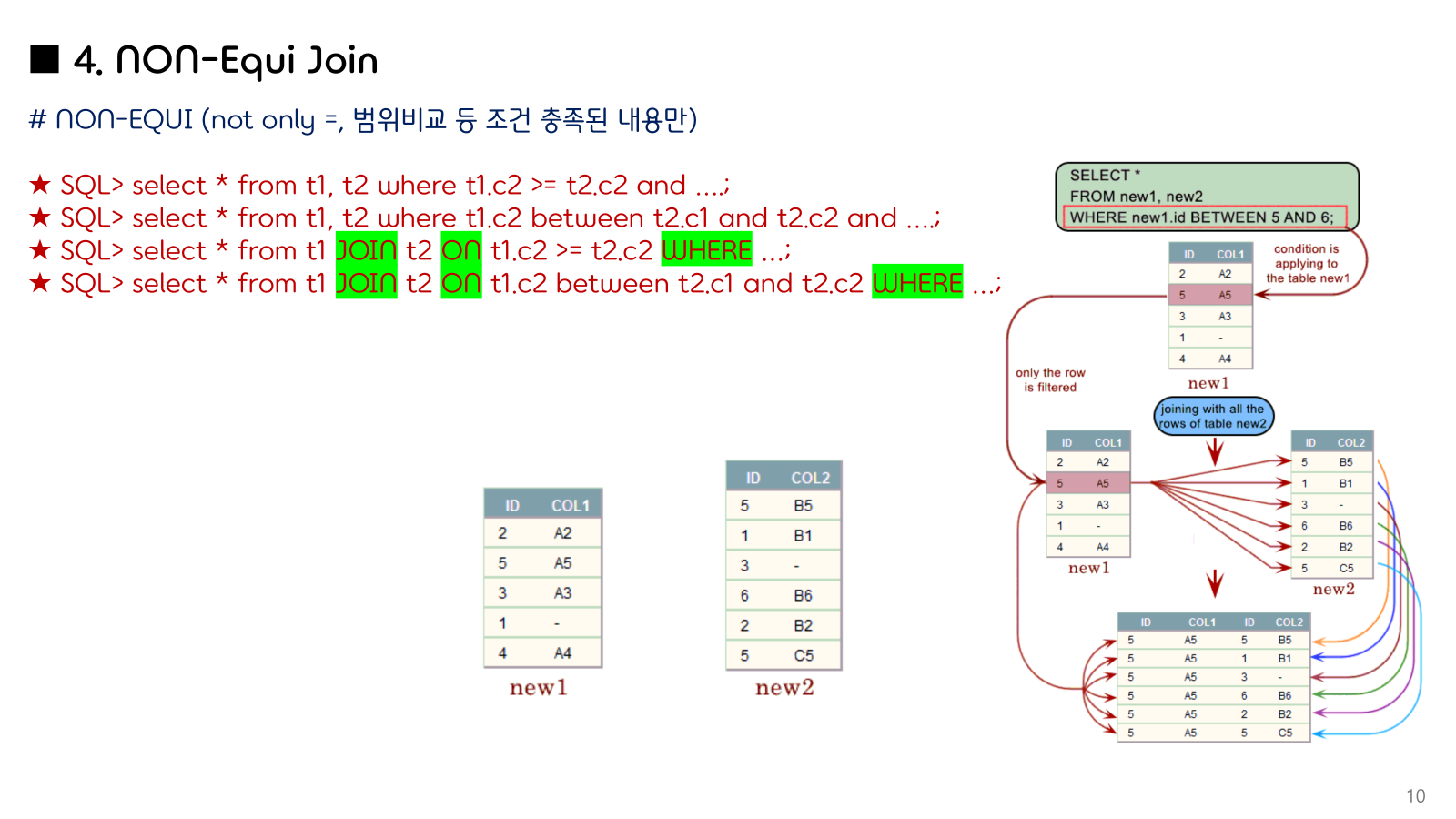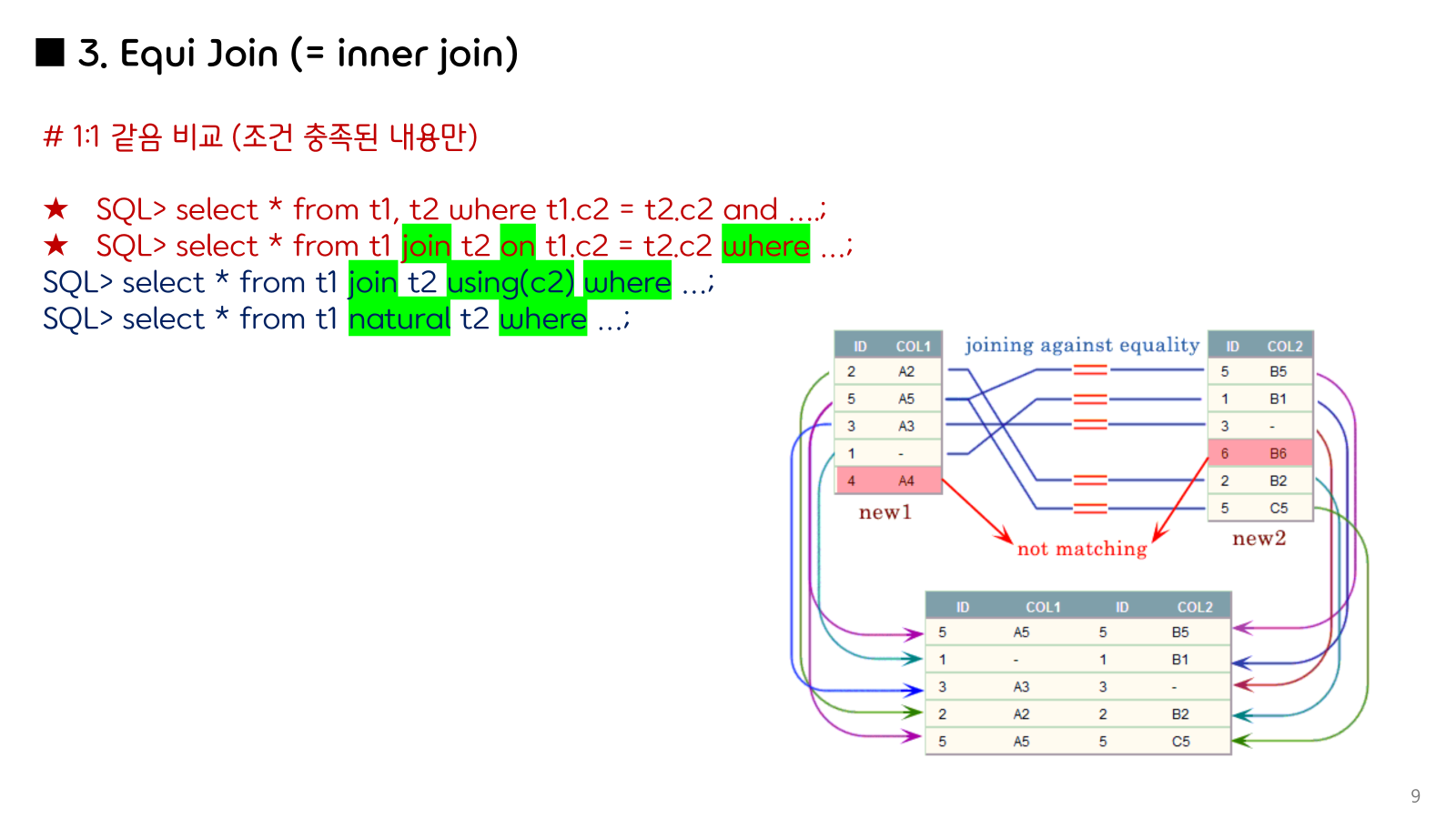 | INNER JOIN | SELECT ... FROM A INNER JOIN B ON A.id = B.id; | A와 B 모두에 존재하는 데이터만 |