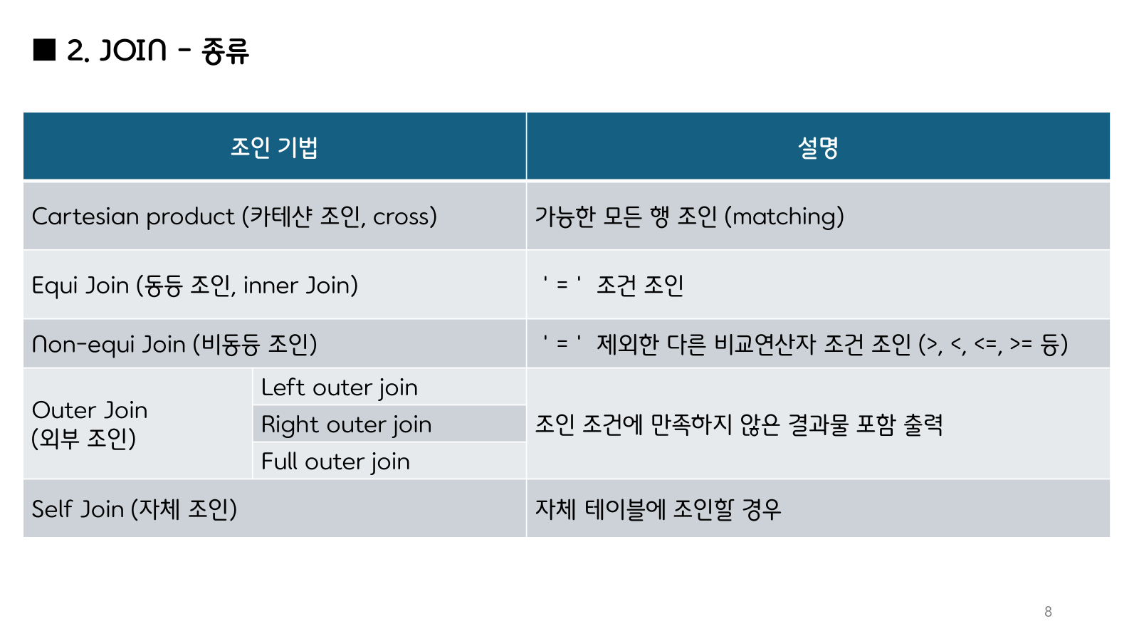 | FULL OUTER JOIN | ❌ MySQL 기본 미지원 (대신 UNION으로 우회 가능) | A와 B 모든 데이터 포함 |