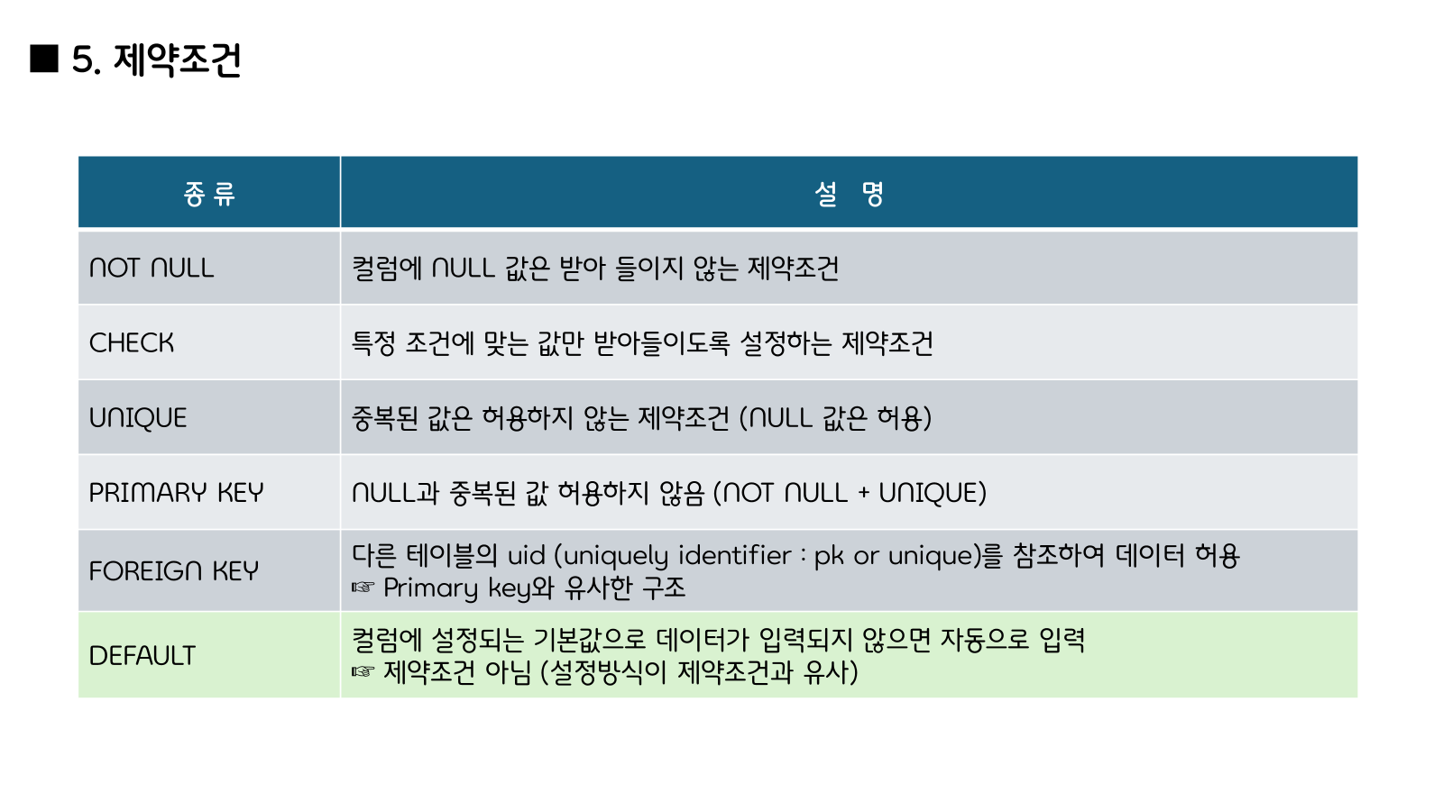 | PRIMARY KEY | 테이블의 고유 식별자, 중복 불가 & NULL 불가 | 학생번호, 주민번호 등 |