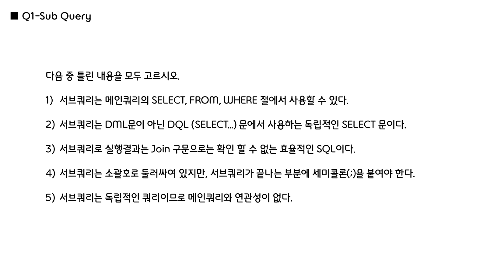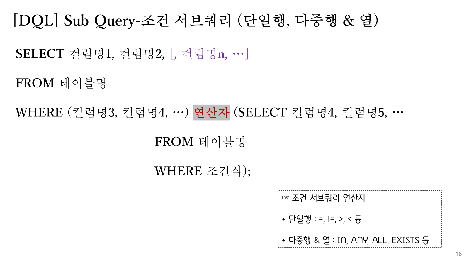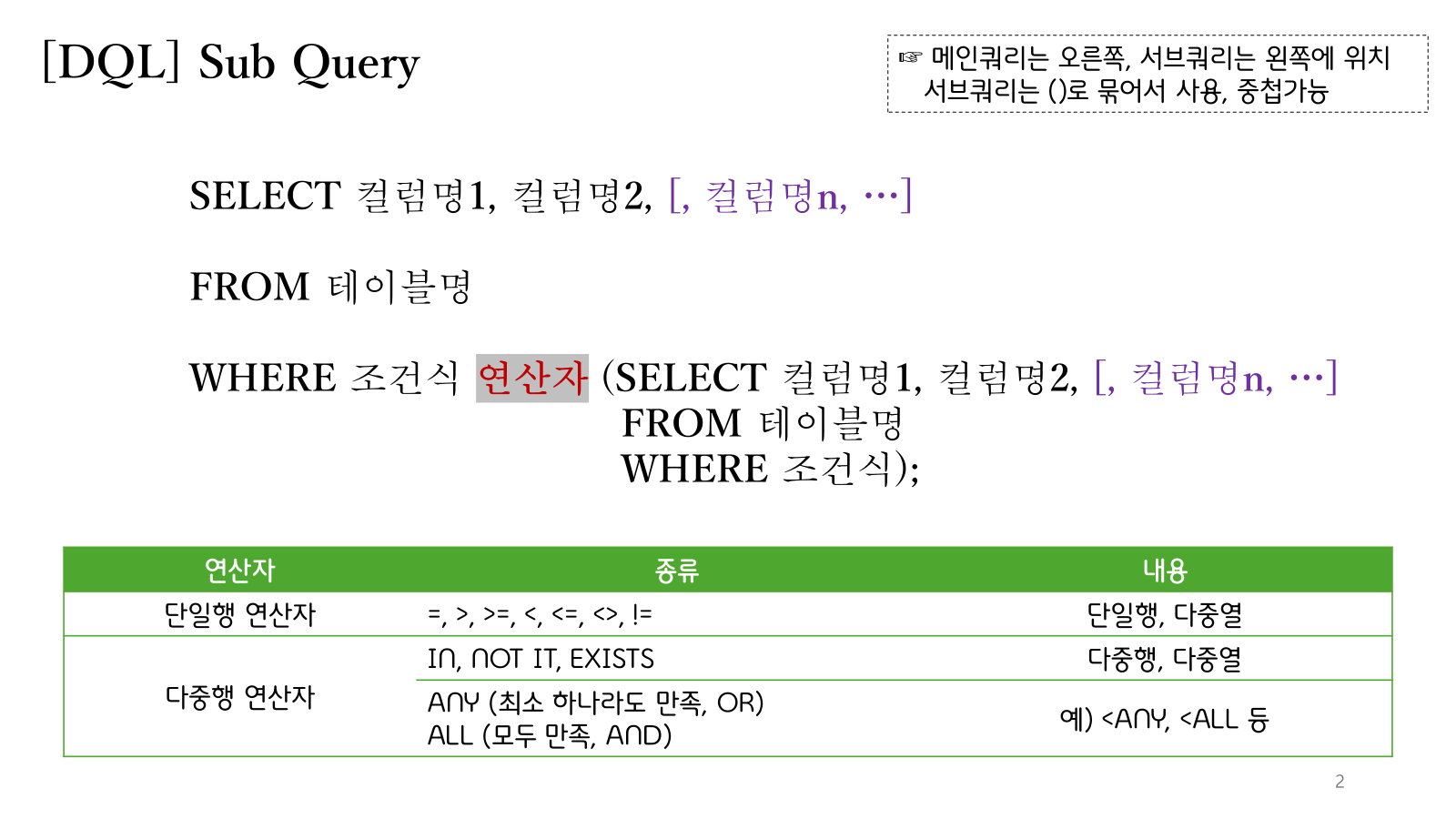 | 사용 목적 | 특정 조건에 맞는 데이터 추출, 집계 함수 결과 활용 등 | 여러 테이블 간의 데이터 결합, 관련된 행 찾기 |