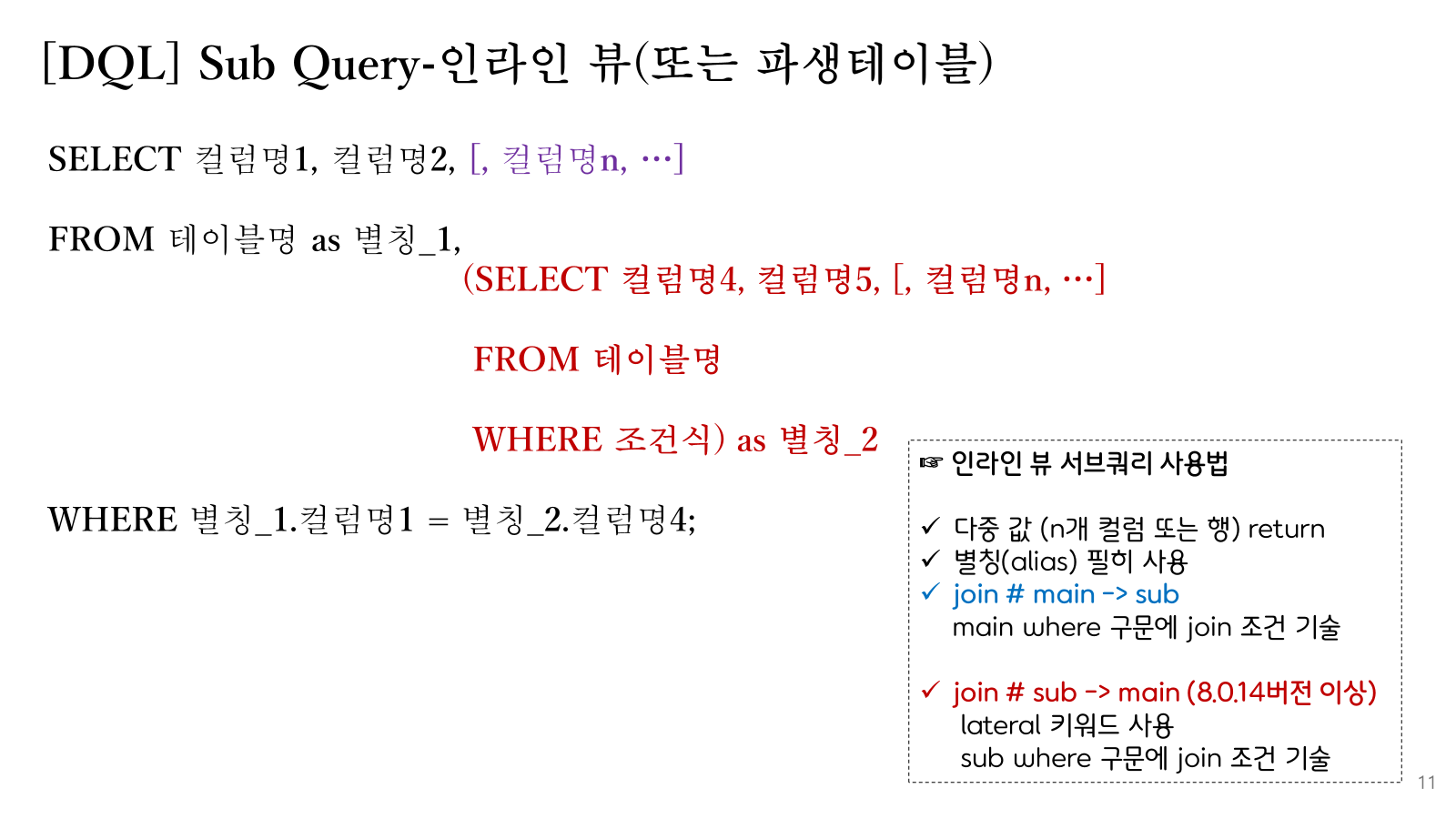 | 구조 | 주 쿼리 안에 중첩된 형태 | 두 테이블을 연결하는 ON 절을 사용 |