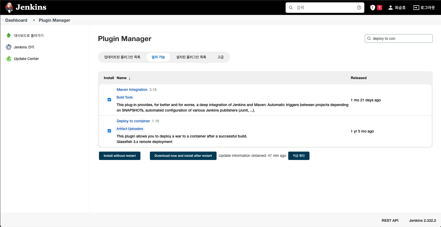 Jenkins 관리 -> 플러그인 관리