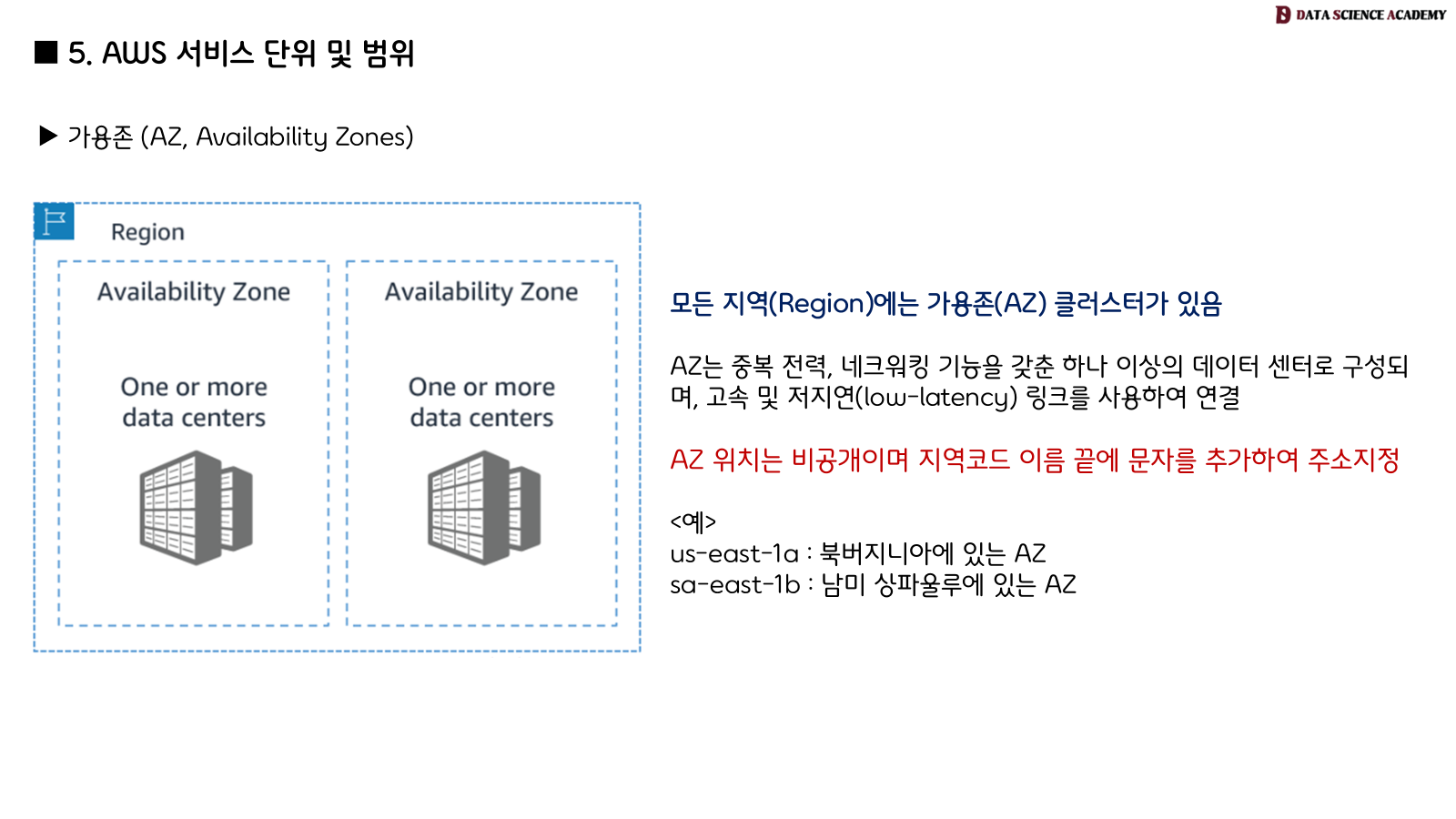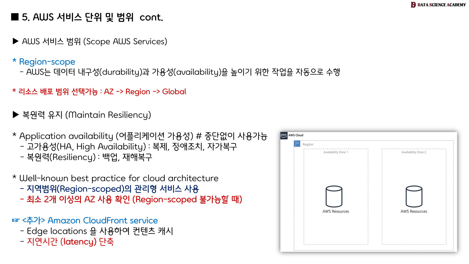 - AWS 서비스의 범위는 서비스의 기능, 가용성, 성능 요구 사항에 따라 결정됩니다.