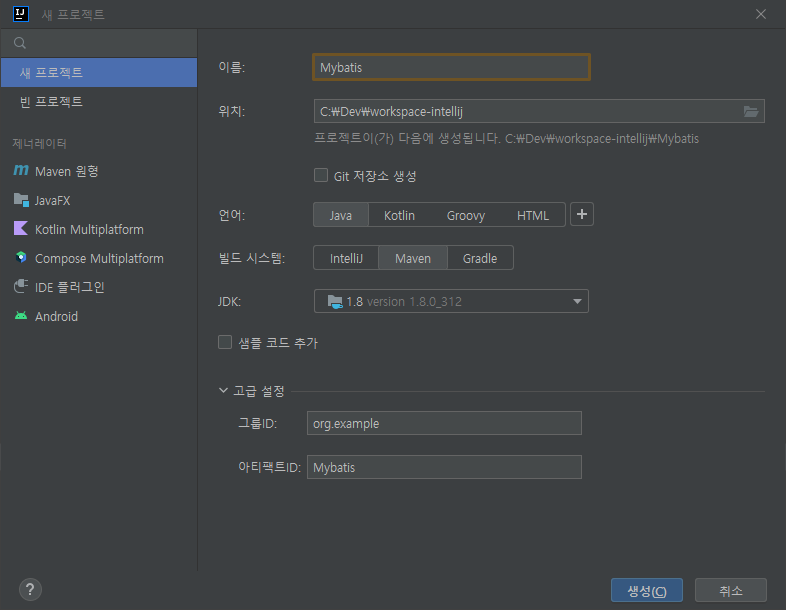 고급 설정 : 그룹 ID (기본값)와 아티팩트 ID(프로젝트 명) 지정