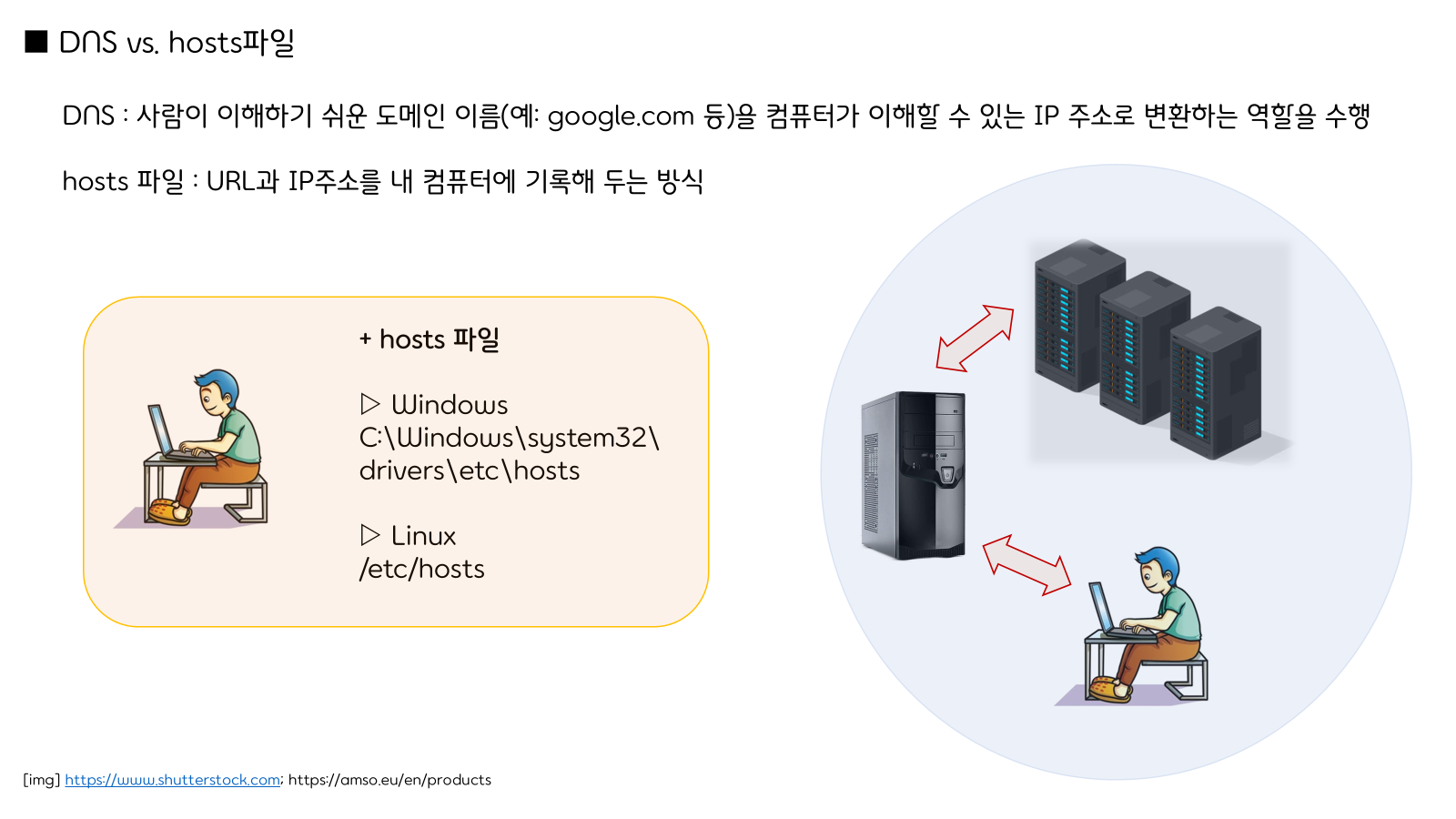 DNS 서버와 hosts 파일은 모두 호스트 이름(예: google.com)을 IP 주소(예: 172.217.160.142)로 변환하는 역할을 하지만, 작동 방식과 사용 목적에 차이가 있습니다.