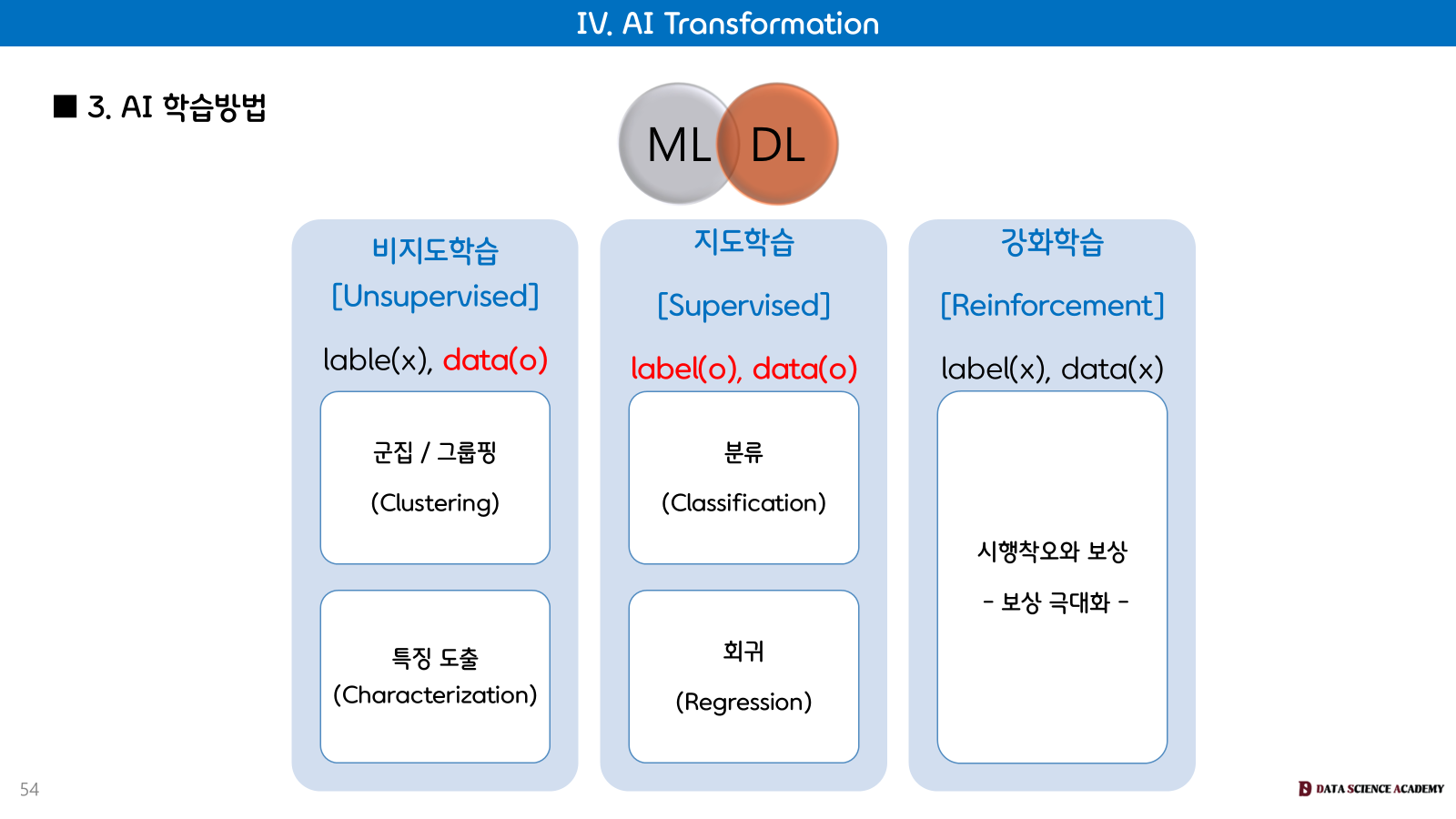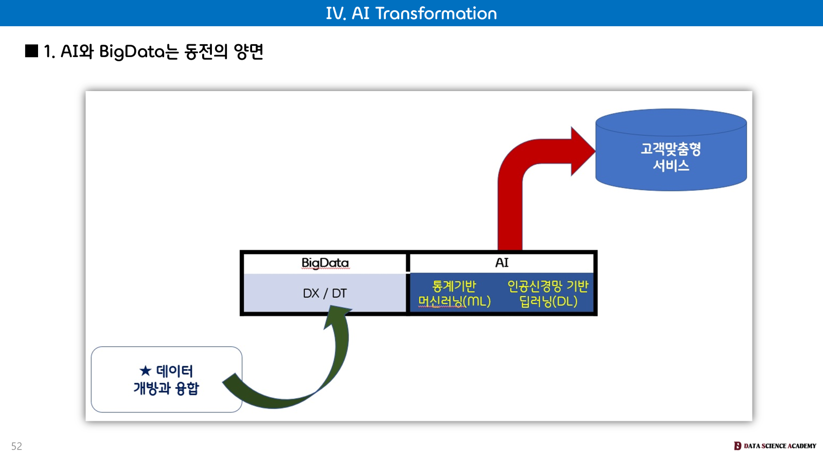 데이터 개방과 융합을 통해 생성된 빅데이터(DX/DT)는 통계 기반 머신러닝(ML)과 인공신경망 기반 딥러닝(DL)을 포함하는 AI 기술을 발전시키고, 이는 최종적으로 고객 맞춤형 서비스로 연결됩니다.