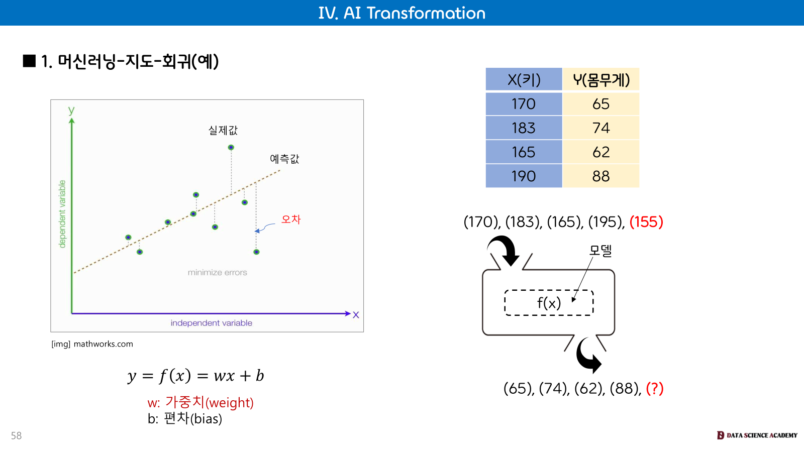 머신러닝-지도-회귀 예시: y=f(x)=wx+b 모델을 사용하여 실제값과 예측값의 오차를 최소화하는 방식으로 학습합니다. 여기서w는 가중치(weight), b는 편차(bias)를 의미합니다.