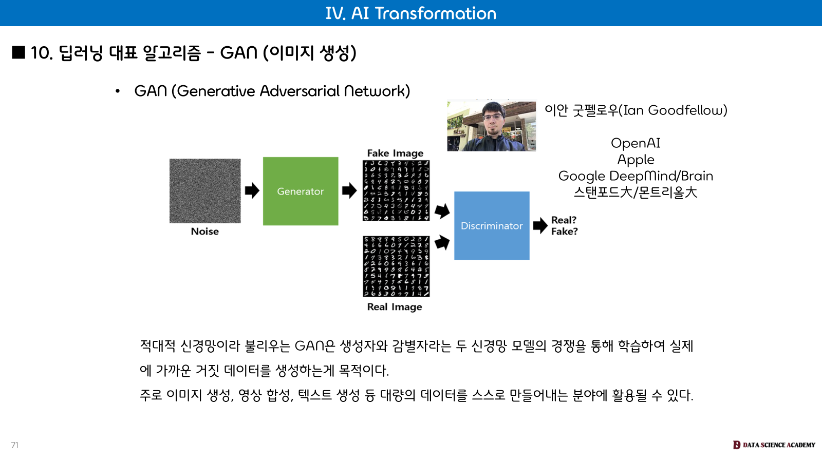 GAN (Generative Adversarial Network): 생성자(Generator)와 감별자(Discriminator)라는 두 신경망 모델의 경쟁을 통해 실제에 가까운 거짓 데이터를 생성하는 것이 목적이며, 주로 이미지 생성, 영상 합성, 텍스트 생성 등 대량의 데이터를 스스로 만들어내는 분야에 활용될 수 있습니다. 이안 굿펠로우가 주요 연구자입니다.