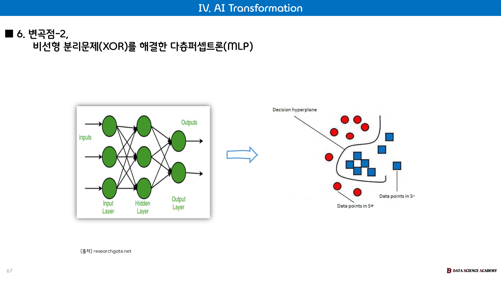 Multi-layered Perceptron (MLP, 1986년): 민스키와 페퍼트가 단층 퍼셉트론의 한계를 증명하며 다층 퍼셉트론의 필요성을 제시했습니다. 룸멜하트와 맥클리랜드가 오차역전파법(Backpropagation)을 제시하며 비선형 분류 문제를 해결하는 효과적인 학습 방법을 제공했습니다.