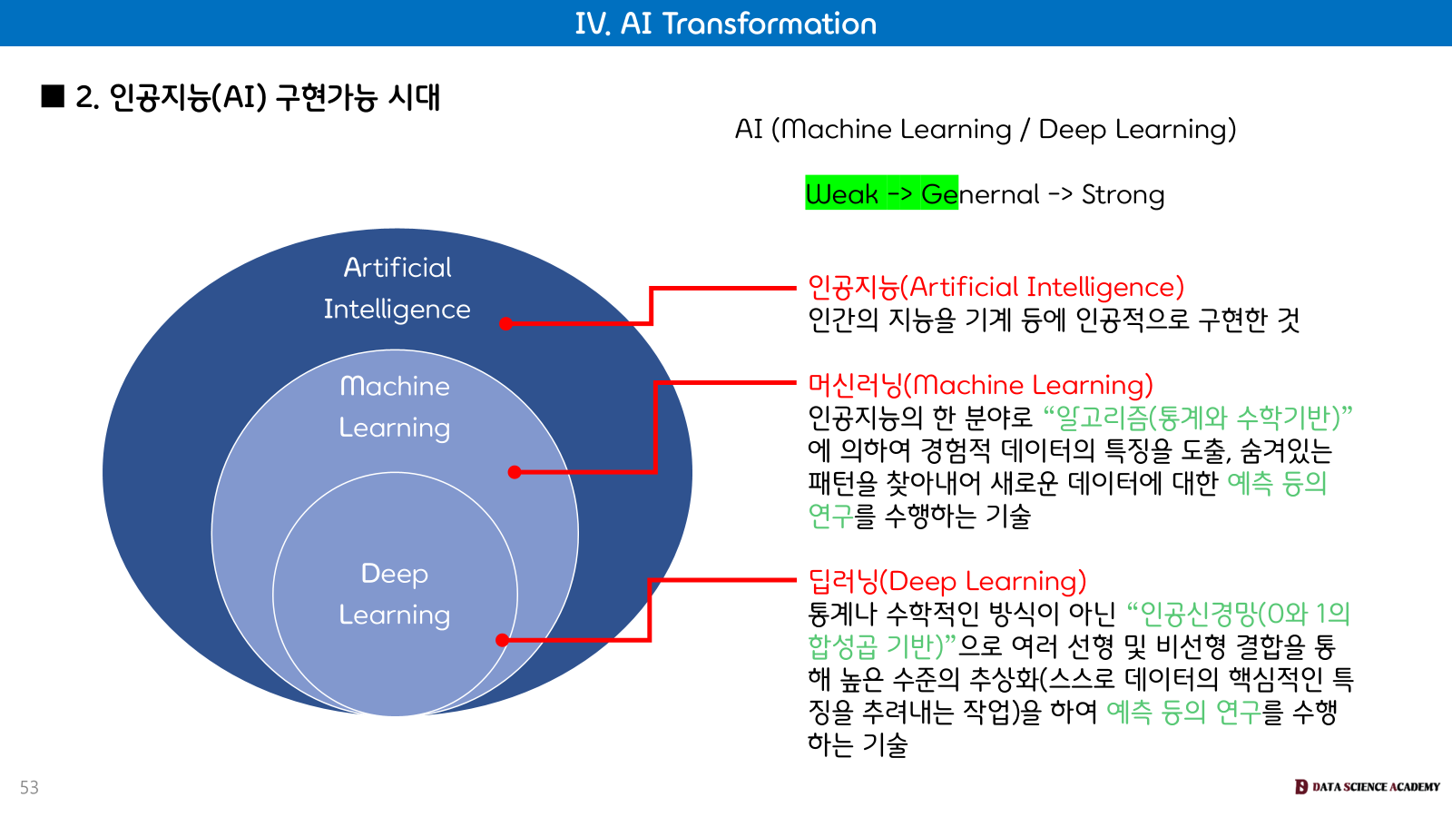 인공지능은 현재 약한(Weak) 수준에서 일반적인(General) 수준을 거쳐 강력한(Strong) 수준으로 발전하고 있습니다 (약 2045년경 Strong AI 예상).