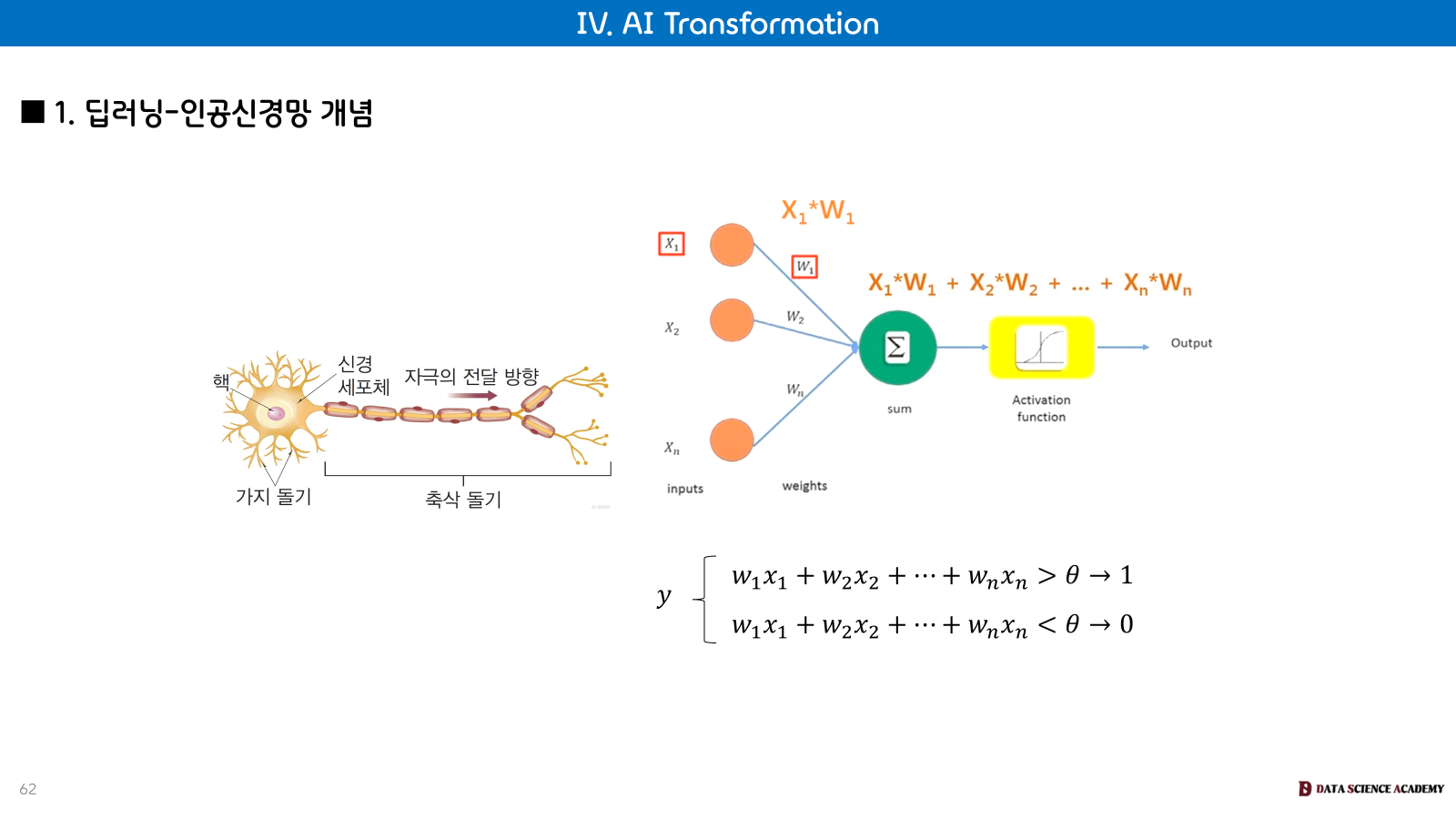 딥러닝-인공신경망 개념: 인간의 신경 세포(핵, 신경 세포체, 가지 돌기, 축삭 돌기)와 유사하게 입력값(Xn)에 가중치(Wn)를 곱하고 합산(Σ)한 후 활성화 함수(Activation function)를 통해 출력(Output)을 내는 방식으로 작동합니다.