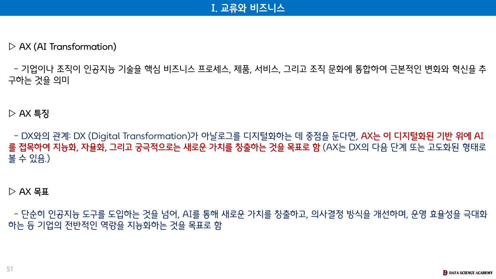 AX 목표: 단순히 인공지능 도구를 도입하는 것을 넘어, AI를 통해 새로운 가치를 창출하고, 의사결정 방식을 개선하며, 운영 효율성을 극대화하는 등 기업의 전반적인 역량을 지능화하는 것을 목표로 합니다.
