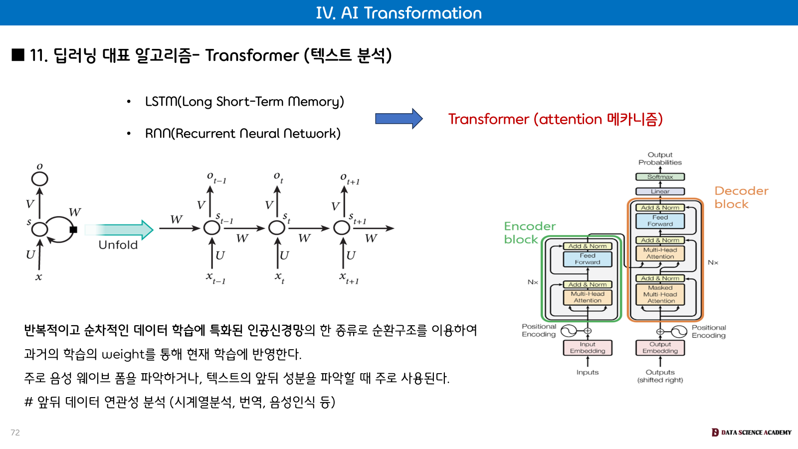 Transformer: RNN의 한계를 보완하기 위해 '어텐션(attention) 메커니즘'을 적용한 모델로, 텍스트 분석에 혁신을 가져왔습니다.