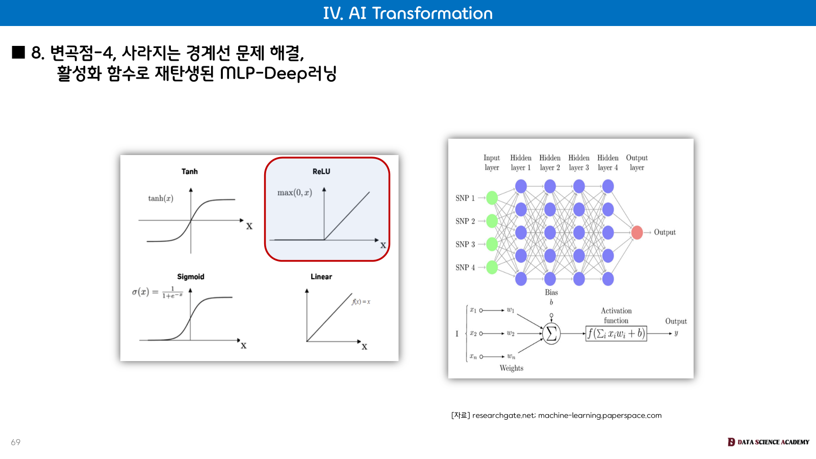 Deep Neural Network (DNN, 2006년): 제프리 힌턴이 Pre-training 기법과 ReLU(활성화 함수) 등을 통해 MLP의 경사 소실 문제를 개선하면서 딥러닝 시대가 도래했습니다. 알파고(AlphaGo)는 48층의 MLP로 구성되어 16만 개의 바둑 데이터로 학습된 대표적인 딥러닝 사례입니다.