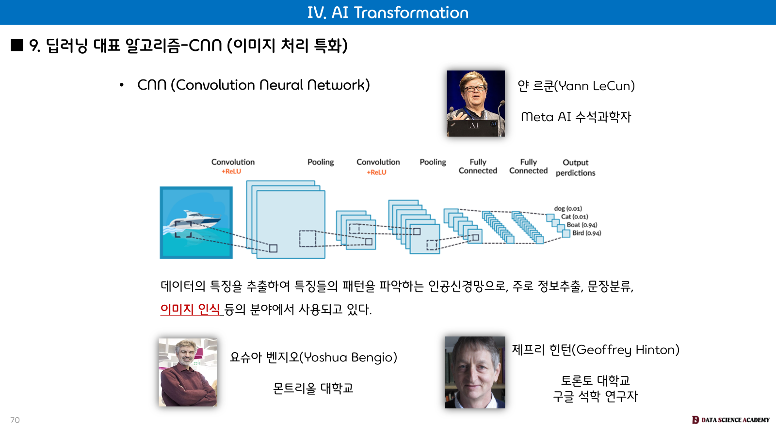 CNN (Convolutional Neural Network): 데이터의 특징을 추출하여 패턴을 파악하는 인공신경망으로, 주로 정보 추출, 문장 분류, 이미지 인식 등의 분야에서 사용됩니다. Yann LeCun이 주요 연구자입니다.