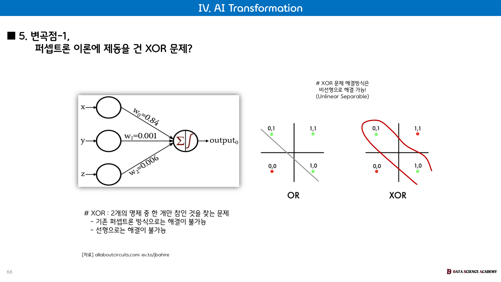 Perceptron (1957년): 프랑크 로젠블라트가 개발한 선형 분류기였지만, XOR 문제(두 명제 중 하나만 참일 경우를 판단)와 같은 비선형 분류 문제를 해결하지 못하는 한계가 있었습니다.