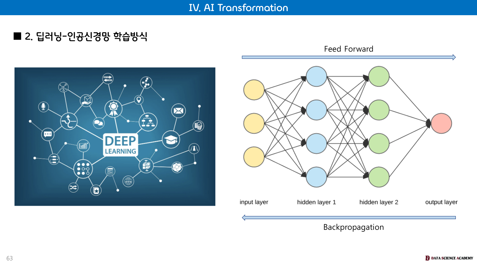딥러닝-인공신경망 학습 방식: 정보가 한 방향으로 흐르는 Feed Forward 방식과, 출력된 오류를 역으로 전파하여 가중치를 조정하는 Backpropagation 방식을 통해 학습합니다.