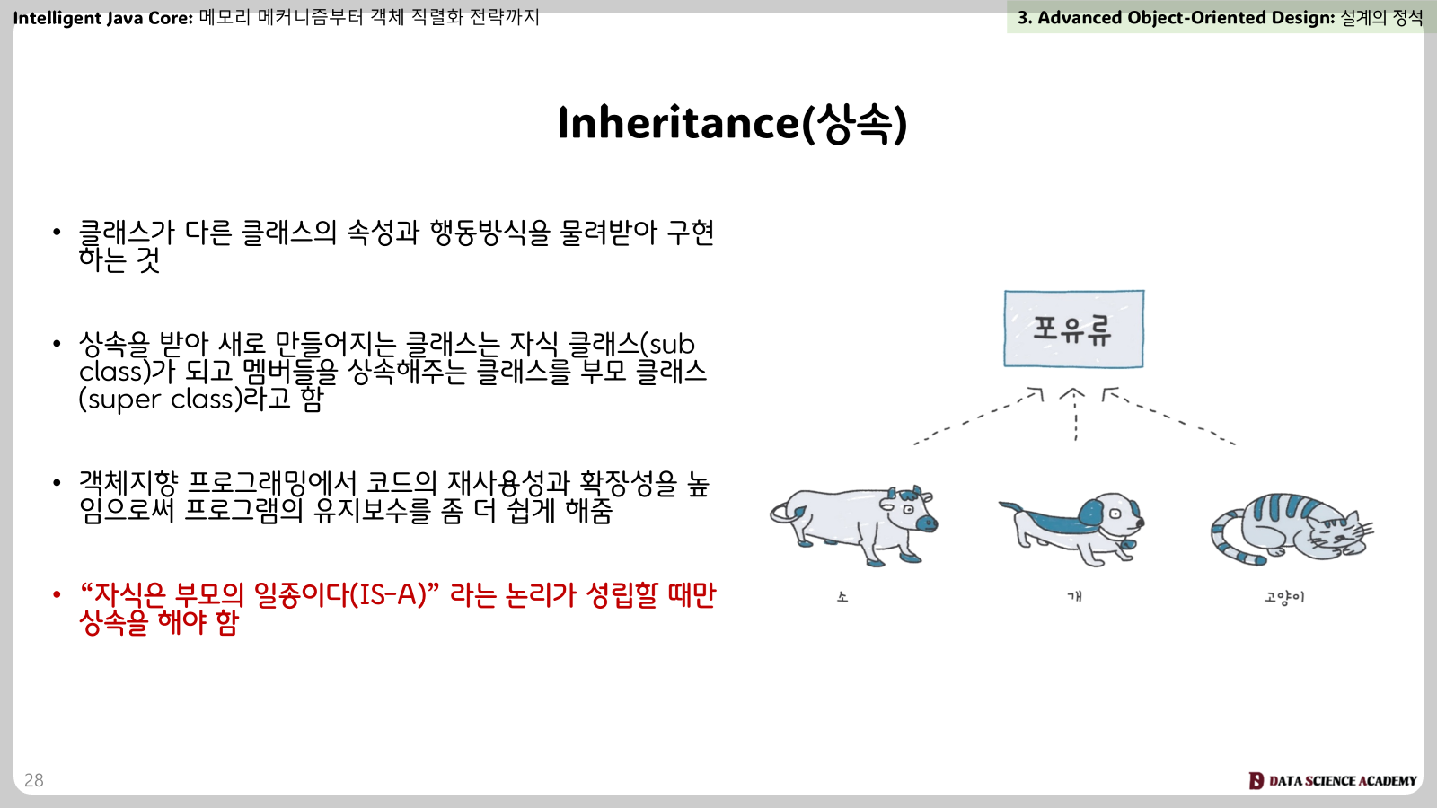 상속은 단순히 '기능이 비슷해서' 쓰는 도구가 아닙니다. 자바 설계의 정석은 **"자식은 부모의 일종이다(IS-A)"**라는 논리가 완벽히 성립할 때만 상속을 허용합니다.
