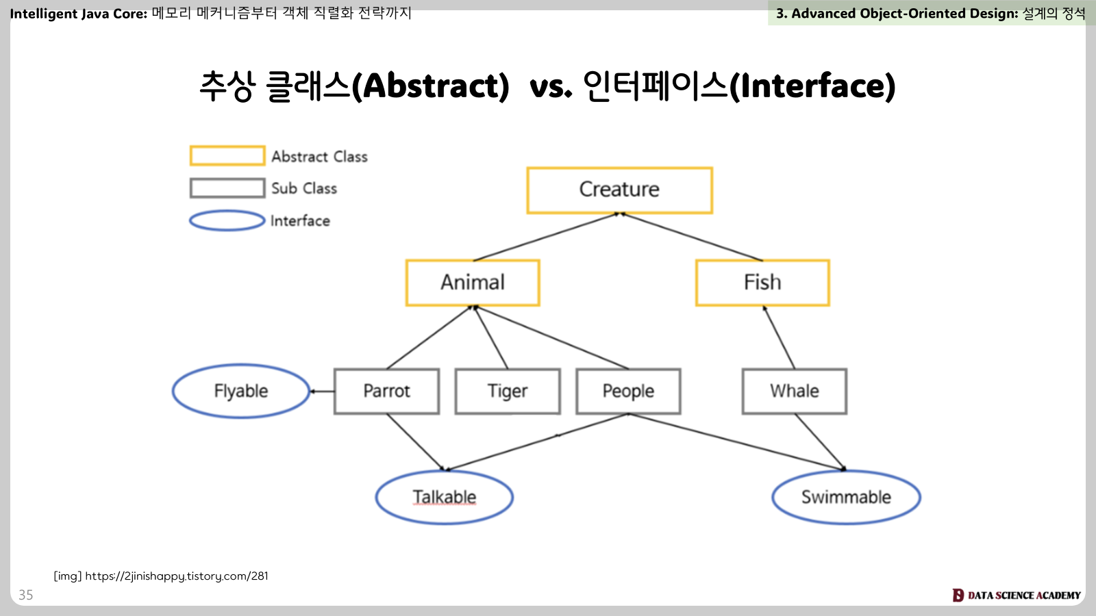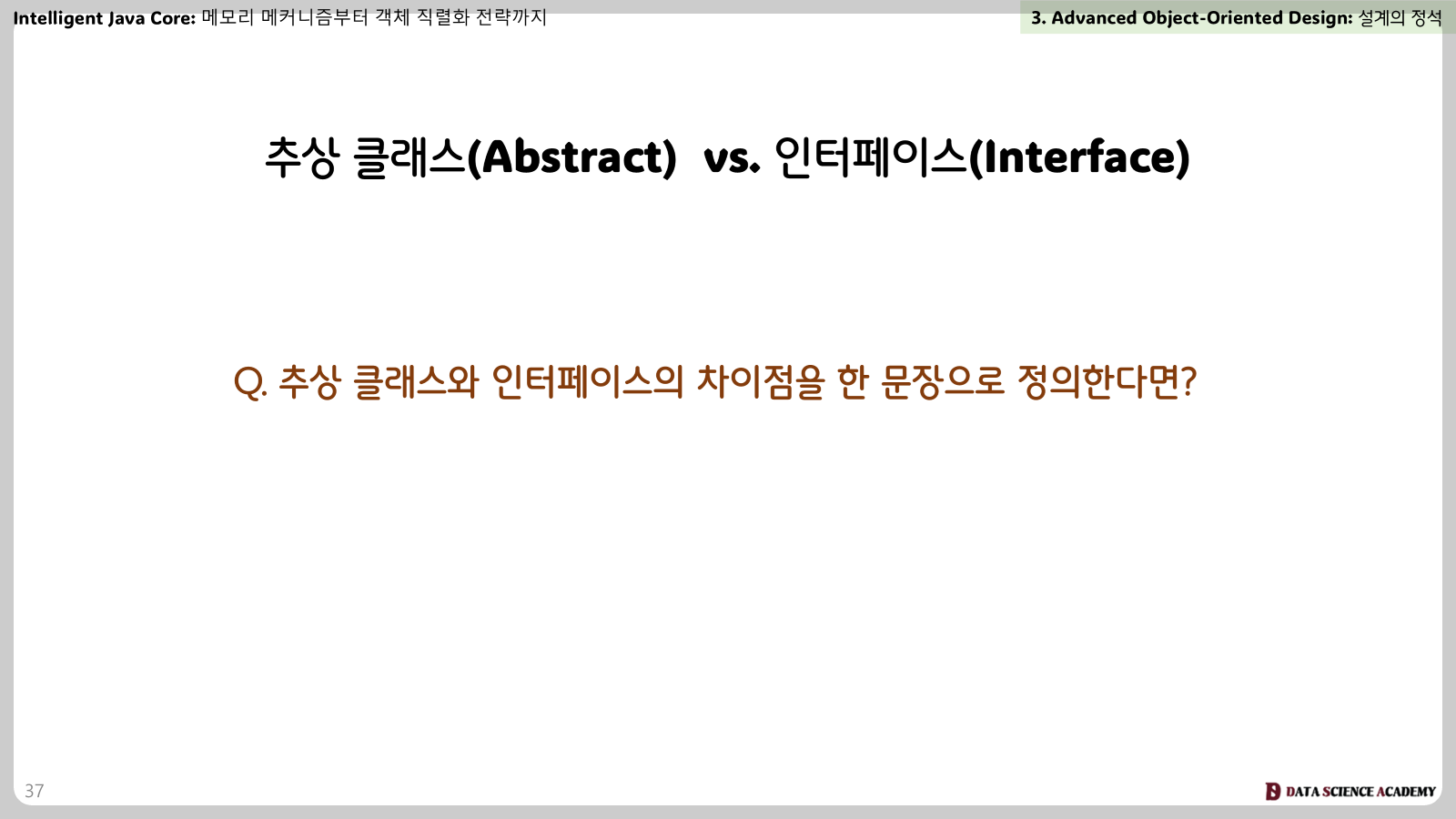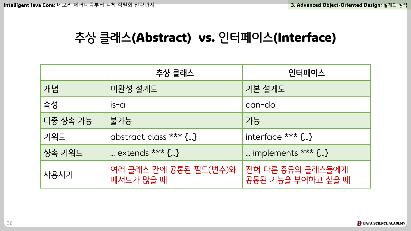 이처럼 **혈통(상속)과 능력(인터페이스)**을 적절히 조합하는 것이 현대 자바 설계의 핵심입니다.