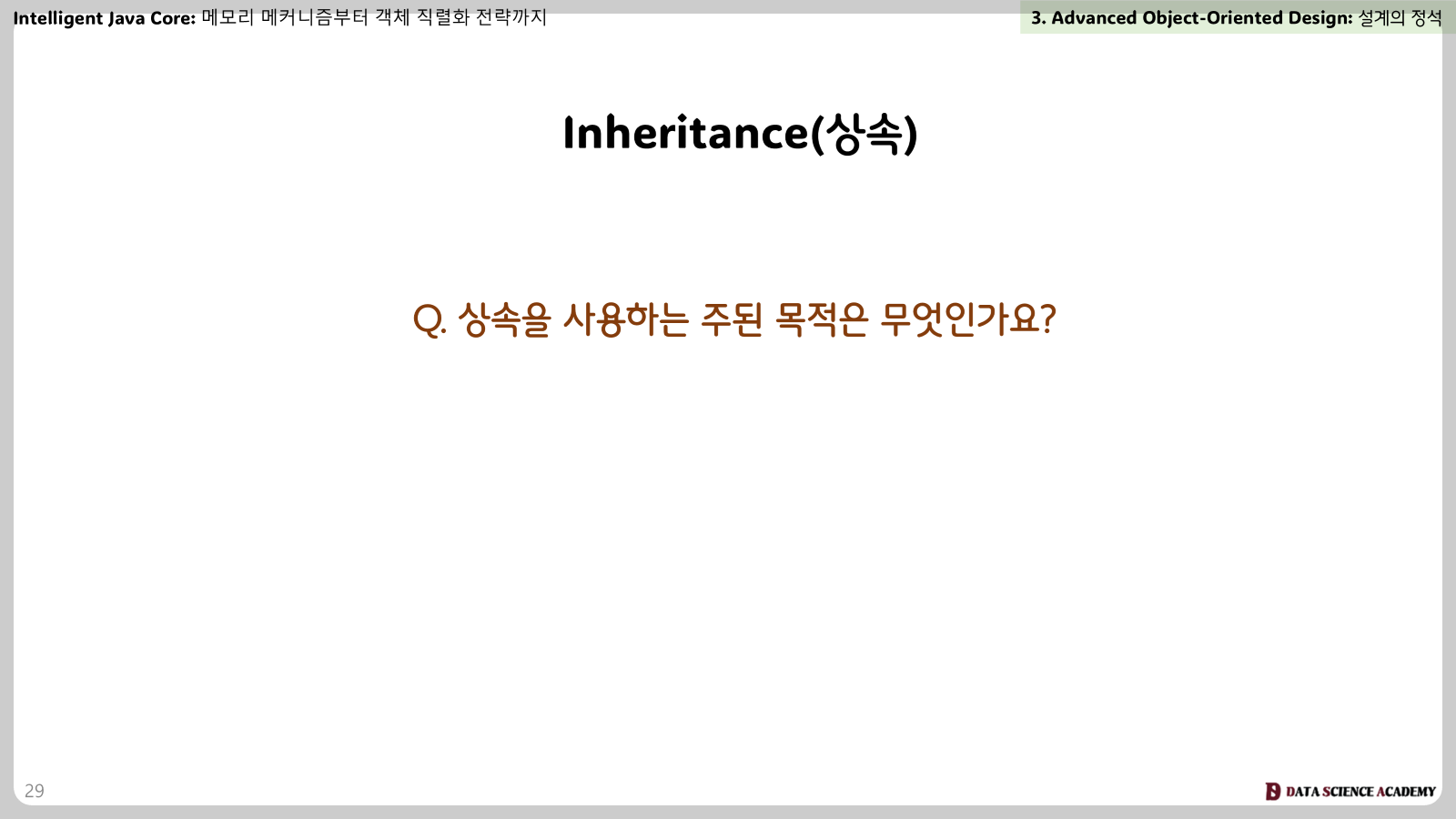 부모의 유산(Code)을 물려받되, 자식만의 고유한 개성(Extension)을 더하는 상속은 자바를 진정한 객체 지향 언어로 만드는 핵심 장치입니다.