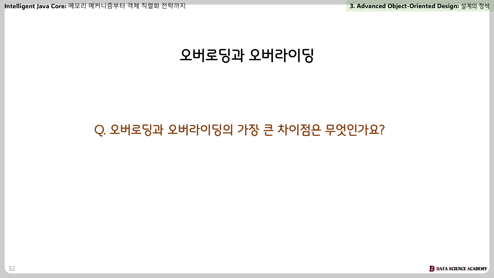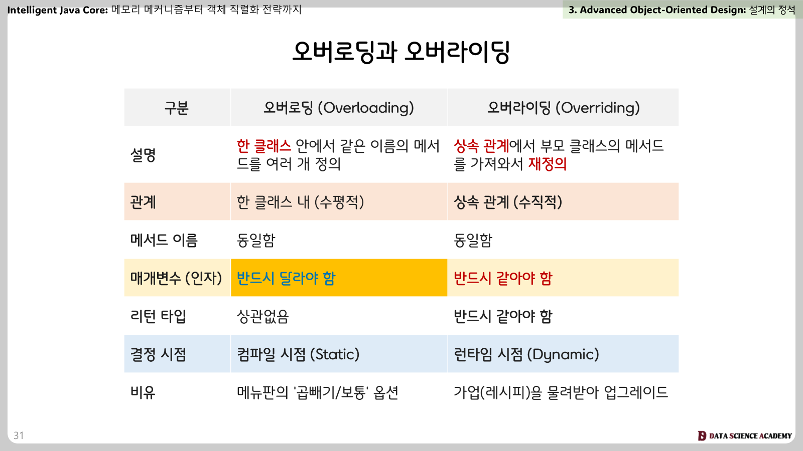 메서드 오버라이딩(Overriding): 부모에게 물려받은 내용을 자식에 맞게 바꾸는 '수직적' 재정의입니다.
