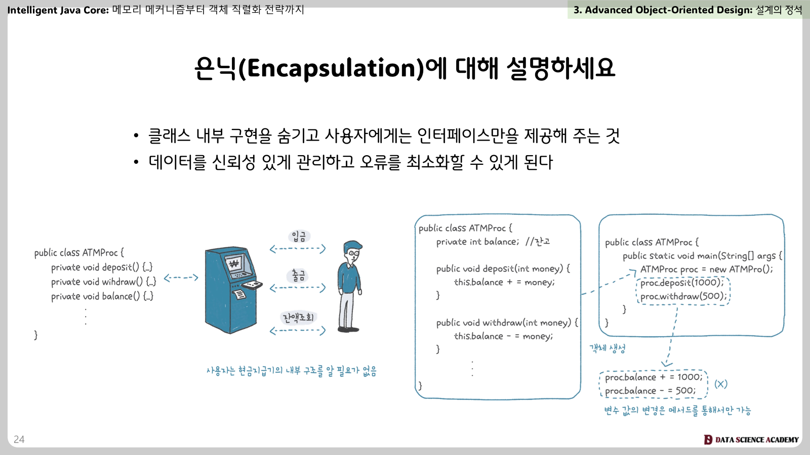 직접 접근 제한: 만약 사용자가 기계를 뜯어 balance 변수 값을 직접 수정하게 둔다면 금융 사고가 날 것입니다. 따라서 변수 값의 변경은 반드시 검증 로직이 포함된 메서드를 통해서만 가능하도록 설계해야 합니다.