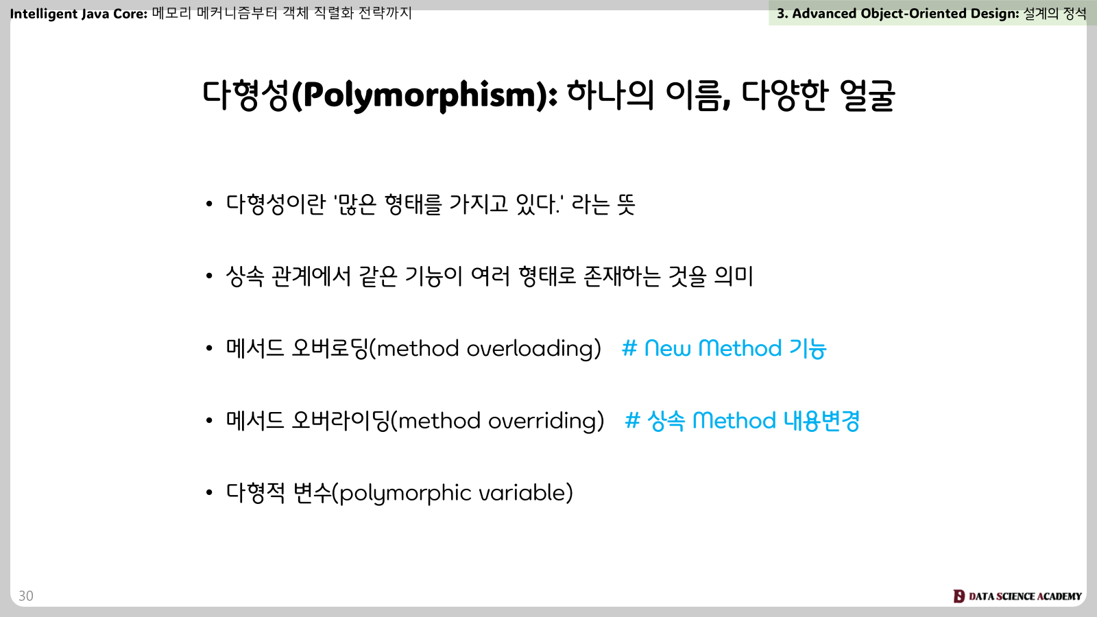 다형적 변수(Polymorphic Variable): 부모 타입의 변수가 다양한 자식 객체를 가리킬 수 있는 유연함을 의미합니다.