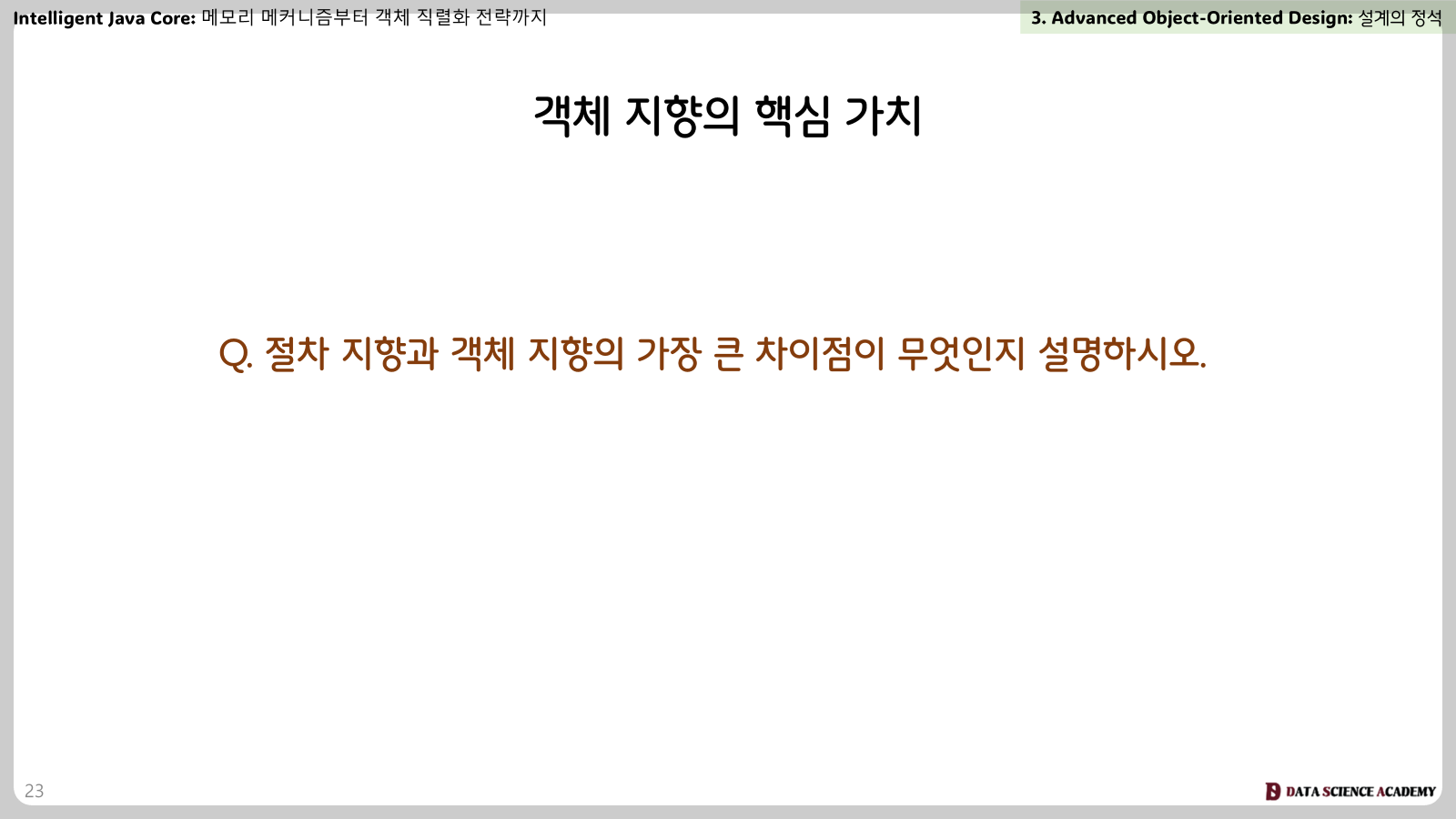 영역의 확장: 기획자가 객체의 속성을 정의하면 개발자가 그 행동방식을 구현합니다. 이제 자바의 객체 지향 개념은 개발 언어를 넘어, 비즈니스 아키텍처를 설계하는 공통의 사고 도구가 되었습니다.