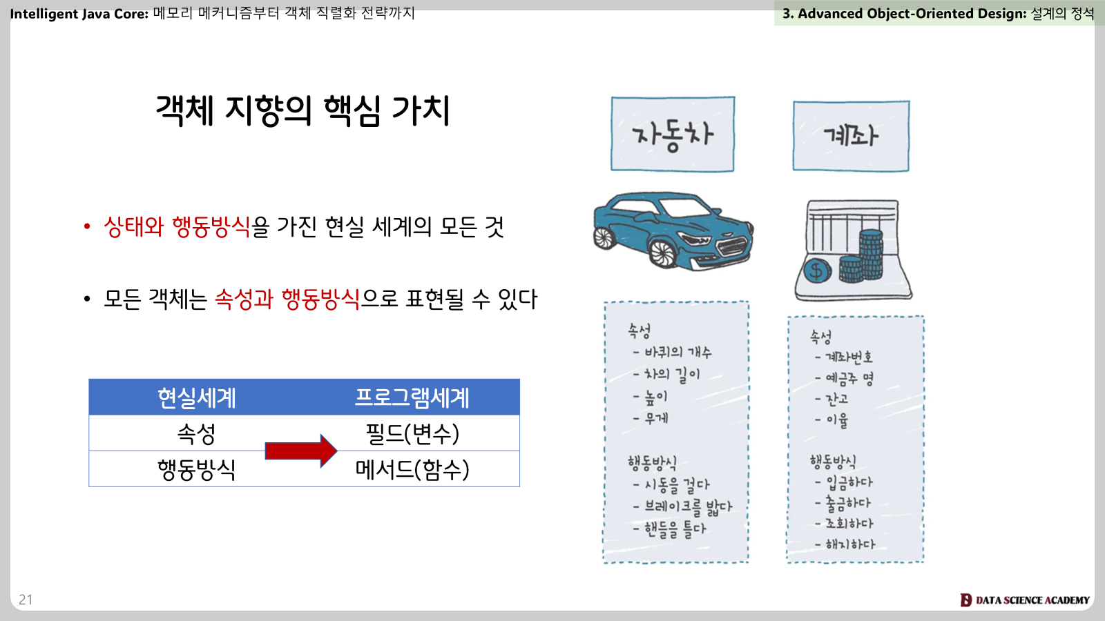 행동방식(Behavior) → 메서드(Method/함수): 객체가 하는 행위 (예: 자동차의 시동 걸기, 계좌의 입금하기)