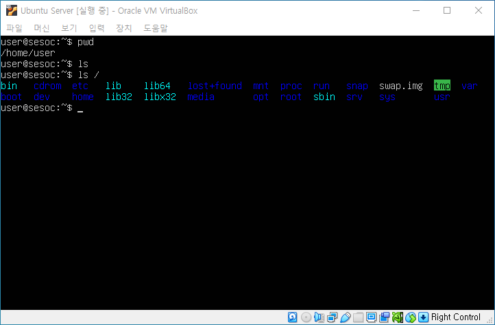 리눅스에의 최상위 경로는 / (root 라고 읽는다.) 이며 현재 경로는 /home/user(root 아래 home 아래 user) 이다.